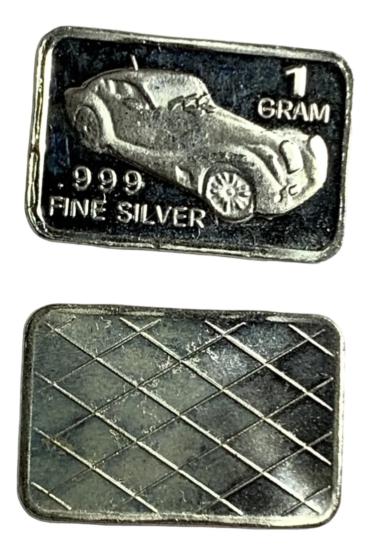 Lingote N°90 1 g plata 24k diseño automĂłvil antiguo. Nostalgia automovilĂstica en miniatura.