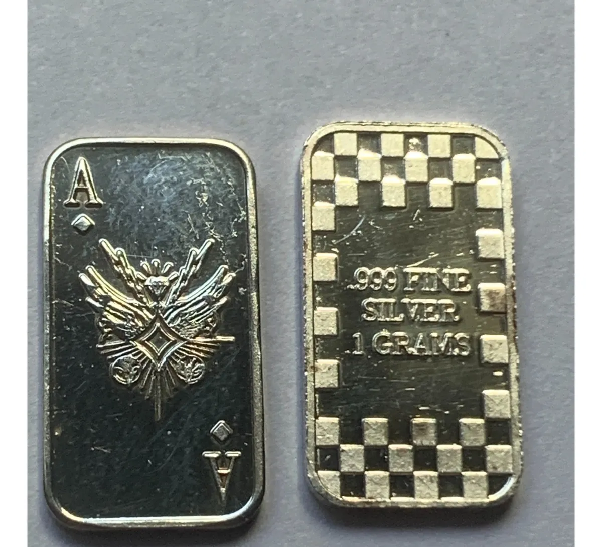 Robmar-U.S.A.-Lingote de 1 gramo de plata pura 0,999-n°117-un As de Picas,-este producto de origen de una refinerĂa USA disponemos de 130 motivos diferentes, animales, armas, personajes, etc, numerados del 1 al 130 ideal para coleccionar e invertir porque la plata aumenta en dĂłlares por lo tanto, es mejor que tener dĂłlares asi si aumenta el dĂłlar y aumenta la plata protege mejor su inversiĂłn a futuro además por su tamaño y precio hace accesible su venta en caso de necesidad, tambiĂ©n están en esta pagina lotes de 3 unidades o de 5 unidades con motivos variados, al comprar estos lotes vera que el costo dividido por gramo le saldrá mas econĂłmico cada gramo, de regalo se adjunta un listado de todos los motivos y nĂşmeros más la historia de la refinerĂa de estados unidos de lo que hace y detalles de ella como un certificado mas