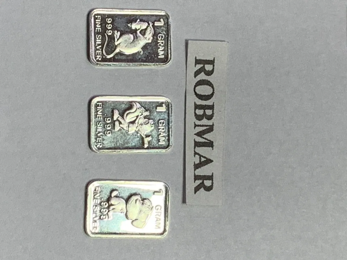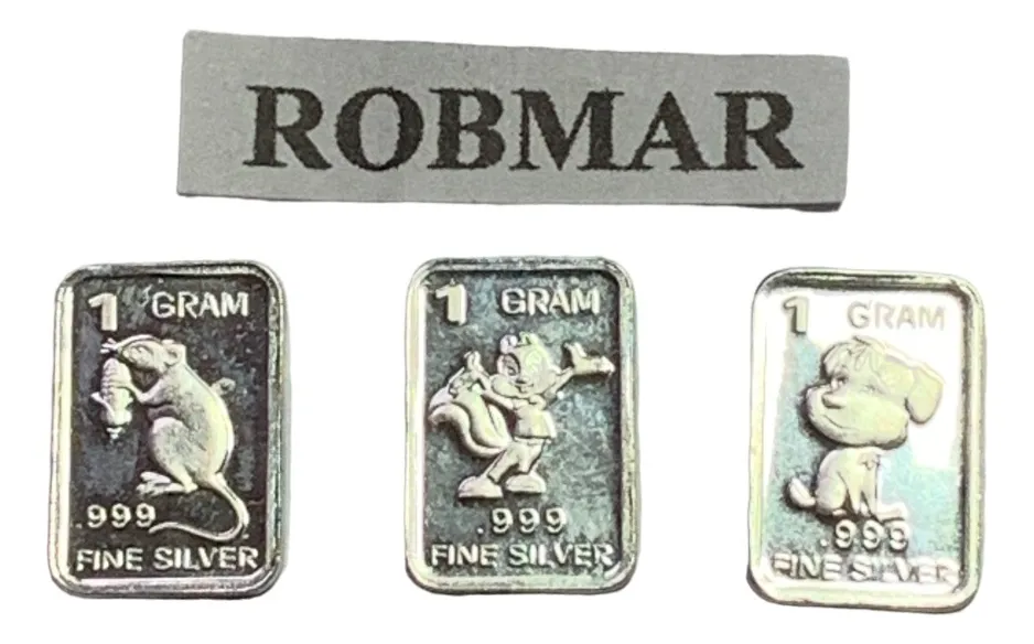 Robmar-U.S.A.-Lote de 3 lingotes x 1 gramo de plata pura 0,999-N°33-total 3 gramos, son 3 motivos diferentes en cada lote ,-este producto de origen de una refinerĂa USA disponemos de muchos motivos en lote de diferentes, animales, armas, personajes, etc, numerados, ideal para coleccionar e invertir porque la plata aumenta en dĂłlares por lo tanto, es mejor que tener dĂłlares asi si aumenta el dĂłlar y aumenta la plata protege mejor su inversiĂłn a futuro además por su tamaño y precio hace accesible su venta en caso de necesidad, tambiĂ©n están en esta página en lingotes por unidad numerados del 1 al 130 y lotes de 3 Y de 5 unidades con motivos variados, al comprar estos lotes vera que el costo dividido por gramo le saldrá más econĂłmico cada gramo, de regalo se adjunta un listado de todos los motivos del 1 al 130 numerados , más la historia de la refinerĂa de estados unidos que los fabrico de lo que hace y detalles de ella como un certificado más y protegidos con capsula plástica y con una descripciĂłn de su contenido