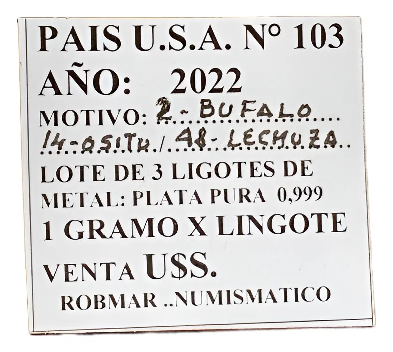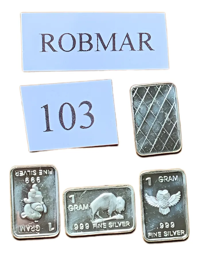 Robmar-U.S.A.-Lote de 3 lingotes x 1 gramo de plata pura 0,999-N°103-total 3 gramos, son 3 motivos diferentes en cada lote ,-este producto de origen de una refinerĂa USA disponemos de muchos motivos en lote de diferentes, animales, armas, personajes, etc, numerados, ideal para coleccionar e invertir porque la plata aumenta en dĂłlares por lo tanto, es mejor que tener dĂłlares asi si aumenta el dĂłlar y aumenta la plata protege mejor su inversiĂłn a futuro además por su tamaño y precio hace accesible su venta en caso de necesidad, tambiĂ©n están en esta página en lingotes por unidad numerados del 1 al 130 y lotes de 3 Y de 5 unidades con motivos variados, al comprar estos lotes vera que el costo dividido por gramo le saldrá más econĂłmico cada gramo, de regalo se adjunta un listado de todos los motivos del 1 al 130 numerados , más la historia de la refinerĂa de estados unidos que los fabrico de lo que hace y detalles de ella como un certificado más y protegidos con capsula plástica y con una descripciĂłn de su contenido