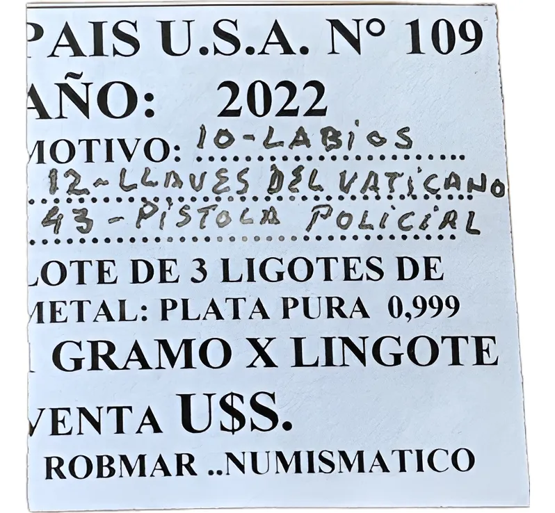 Robmar-U.S.A.-Lote de 3 lingotes x 1 gramo de plata pura 0,999-N°109-total 3 gramos, son 3 motivos diferentes en cada lote ,-este producto de origen de una refinería USA disponemos de muchos motivos en lote de diferentes, animales, armas, personajes, etc, numerados, ideal para coleccionar e invertir porque la plata aumenta en dólares por lo tanto, es mejor que tener dólares asi si aumenta el dólar y aumenta la plata protege mejor su inversión a futuro además por su tamaño y precio hace accesible su venta en caso de necesidad, también están en esta página en lingotes por unidad numerados del 1 al 130 y lotes de 3 Y de 5 unidades con motivos variados, al comprar estos lotes vera que el costo dividido por gramo le saldrá más económico cada gramo, de regalo se adjunta un listado de todos los motivos del 1 al 130 numerados , más la historia de la refinería de estados unidos que los fabrico de lo que hace y detalles de ella como un certificado más y protegidos con capsula plástica y con una descripción de su contenido