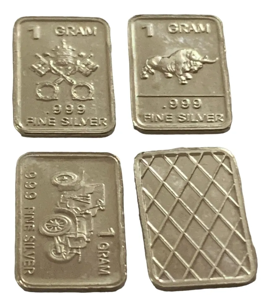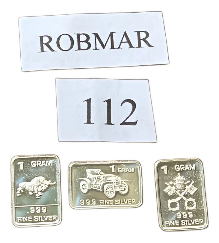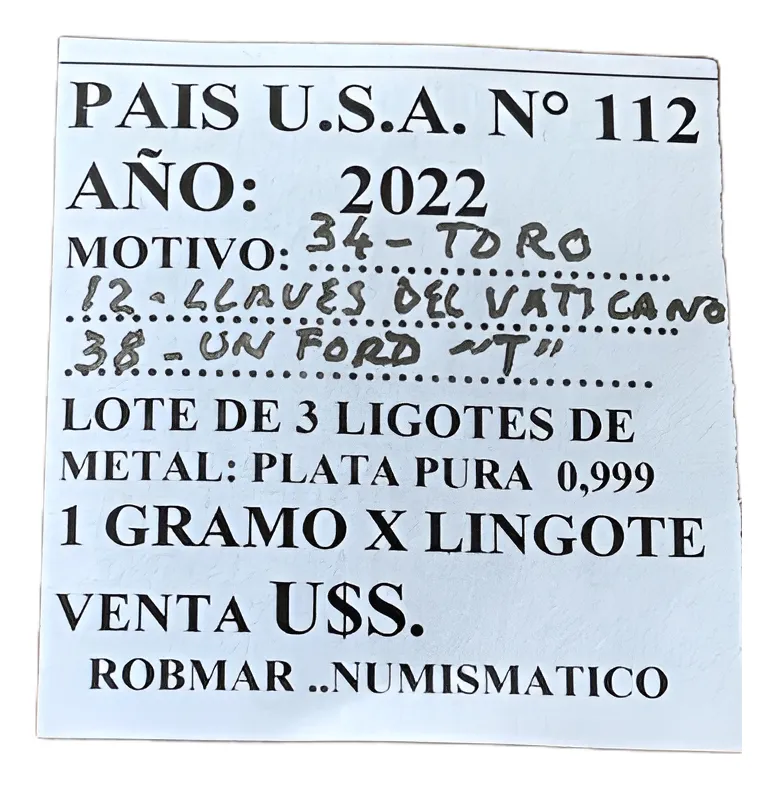 Robmar-U.S.A.-Lote de 3 lingotes x 1 gramo de plata pura 0,999-N°112-total 3 gramos, son 3 motivos diferentes en cada lote ,-este producto de origen de una refinerĂa USA disponemos de muchos motivos en lote de diferentes, animales, armas, personajes, etc, numerados, ideal para coleccionar e invertir porque la plata aumenta en dĂłlares por lo tanto, es mejor que tener dĂłlares asi si aumenta el dĂłlar y aumenta la plata protege mejor su inversiĂłn a futuro además por su tamaño y precio hace accesible su venta en caso de necesidad, tambiĂ©n están en esta página en lingotes por unidad numerados del 1 al 130 y lotes de 3 Y de 5 unidades con motivos variados, al comprar estos lotes vera que el costo dividido por gramo le saldrá más econĂłmico cada gramo, de regalo se adjunta un listado de todos los motivos del 1 al 130 numerados , más la historia de la refinerĂa de estados unidos que los fabrico de lo que hace y detalles de ella como un certificado más y protegidos con capsula plástica y con una descripciĂłn de su contenido