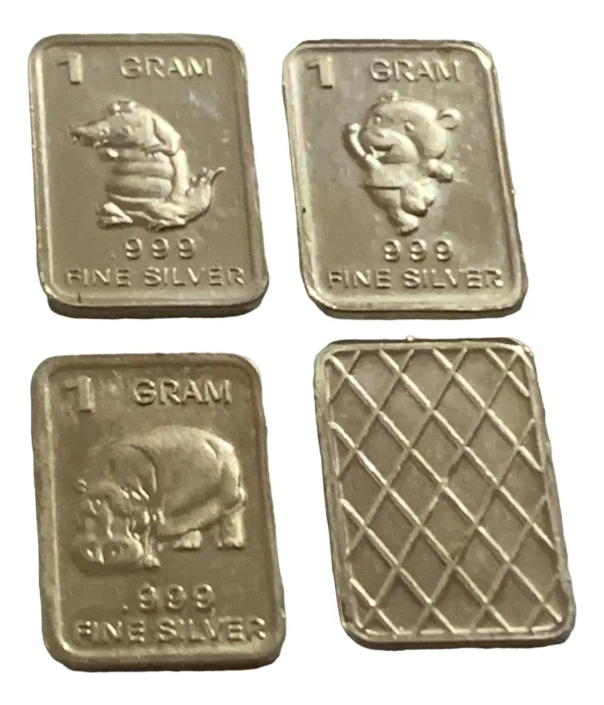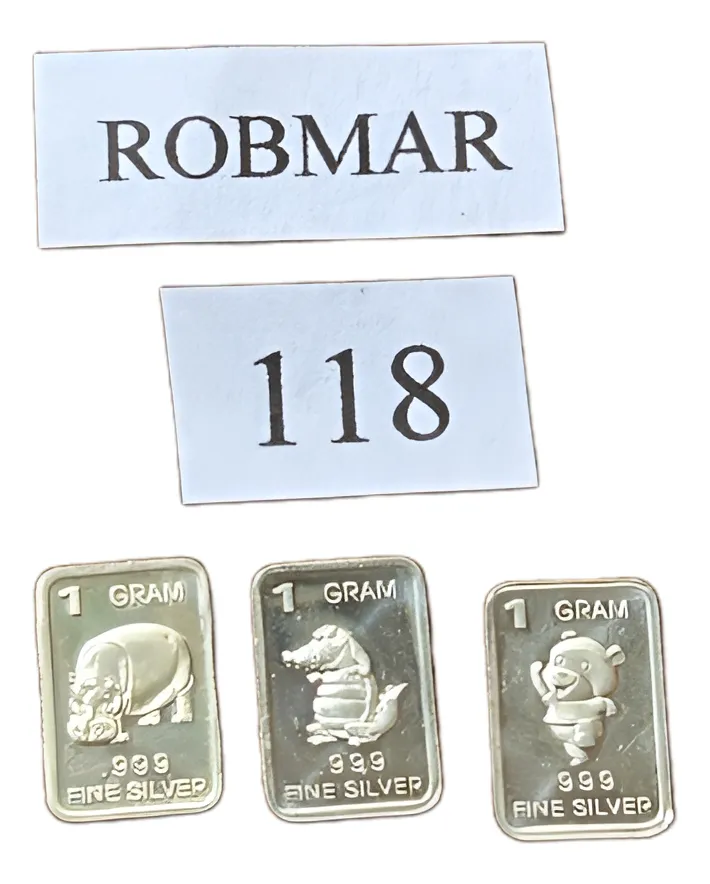Robmar-U.S.A.-Lote de 3 lingotes x 1 gramo de plata pura 0,999-N°118-total 3 gramos, son 3 motivos diferentes en cada lote ,-este producto de origen de una refinerĂa USA disponemos de muchos motivos en lote de diferentes, animales, armas, personajes, etc, numerados, ideal para coleccionar e invertir porque la plata aumenta en dĂłlares por lo tanto, es mejor que tener dĂłlares asi si aumenta el dĂłlar y aumenta la plata protege mejor su inversiĂłn a futuro además por su tamaño y precio hace accesible su venta en caso de necesidad, tambiĂ©n están en esta página en lingotes por unidad numerados del 1 al 130 y lotes de 3 Y de 5 unidades con motivos variados, al comprar estos lotes vera que el costo dividido por gramo le saldrá más econĂłmico cada gramo, de regalo se adjunta un listado de todos los motivos del 1 al 130 numerados , más la historia de la refinerĂa de estados unidos que los fabrico de lo que hace y detalles de ella como un certificado más y protegidos con capsula plástica y con una descripciĂłn de su contenido