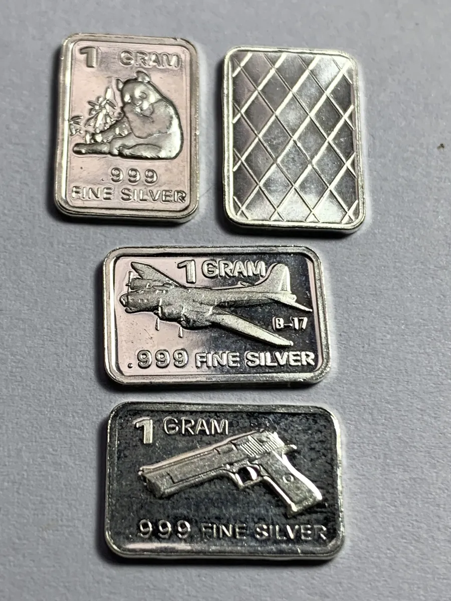 Robmar-U.S.A.-Lote de 3 lingotes x 1 gramo de plata pura 0,999-N°304-total 3 gramos, son 3 motivos diferentes en cada lote ,-este producto de origen de una refinerĂa USA disponemos de muchos motivos en lote de diferentes, animales, armas, personajes, etc, numerados, ideal para coleccionar e invertir porque la plata aumenta en dĂłlares por lo tanto, es mejor que tener dĂłlares asi si aumenta el dĂłlar y aumenta la plata protege mejor su inversiĂłn a futuro además por su tamaño y precio hace accesible su venta en caso de necesidad, tambiĂ©n están en esta página en lingotes por unidad numerados del 1 al 130 y lotes de 3 Y de 5 unidades con motivos variados, al comprar estos lotes vera que el costo dividido por gramo le saldrá más econĂłmico cada gramo, de regalo se adjunta un listado de todos los motivos del 1 al 130 numerados , más la historia de la refinerĂa de estados unidos que los fabrico de lo que hace y detalles de ella como un certificado más y protegidos con capsula plástica y con una descripciĂłn de su contenido