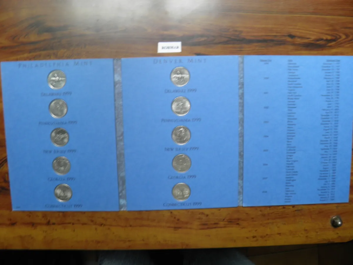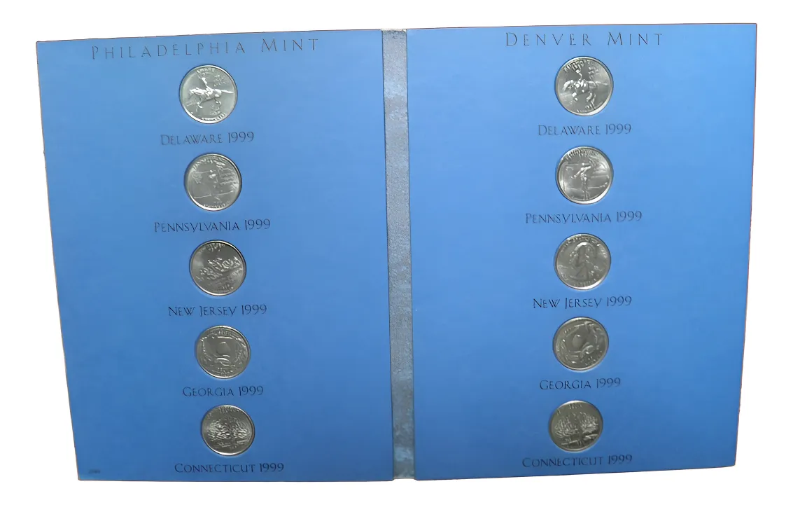 Colección de 10 quarters USA año 1999, incluye primeras emisiones del programa de los 50 estados. Pack ideal para iniciar serie de State Quarters. estas son las de los estados que tiene estados unidos y usan su moneda y completan asi la cifra de 56 estados de esta serie con la ceca de Pensilvania y Denver 5 de cada ceca en estuche especial con sus alojamientos completos para albergar las 10 monedas de dicho año, la serie salió entre 1999 al 2009, y nunca mas emitirán este año por lo tanto a futuro cada vez aumentaran la demanda de esta primera fecha de la emisión porque los coleccionistas la guardan y no salen mas a la venta son 10 quartes mas el estuche completado de ese año emitido