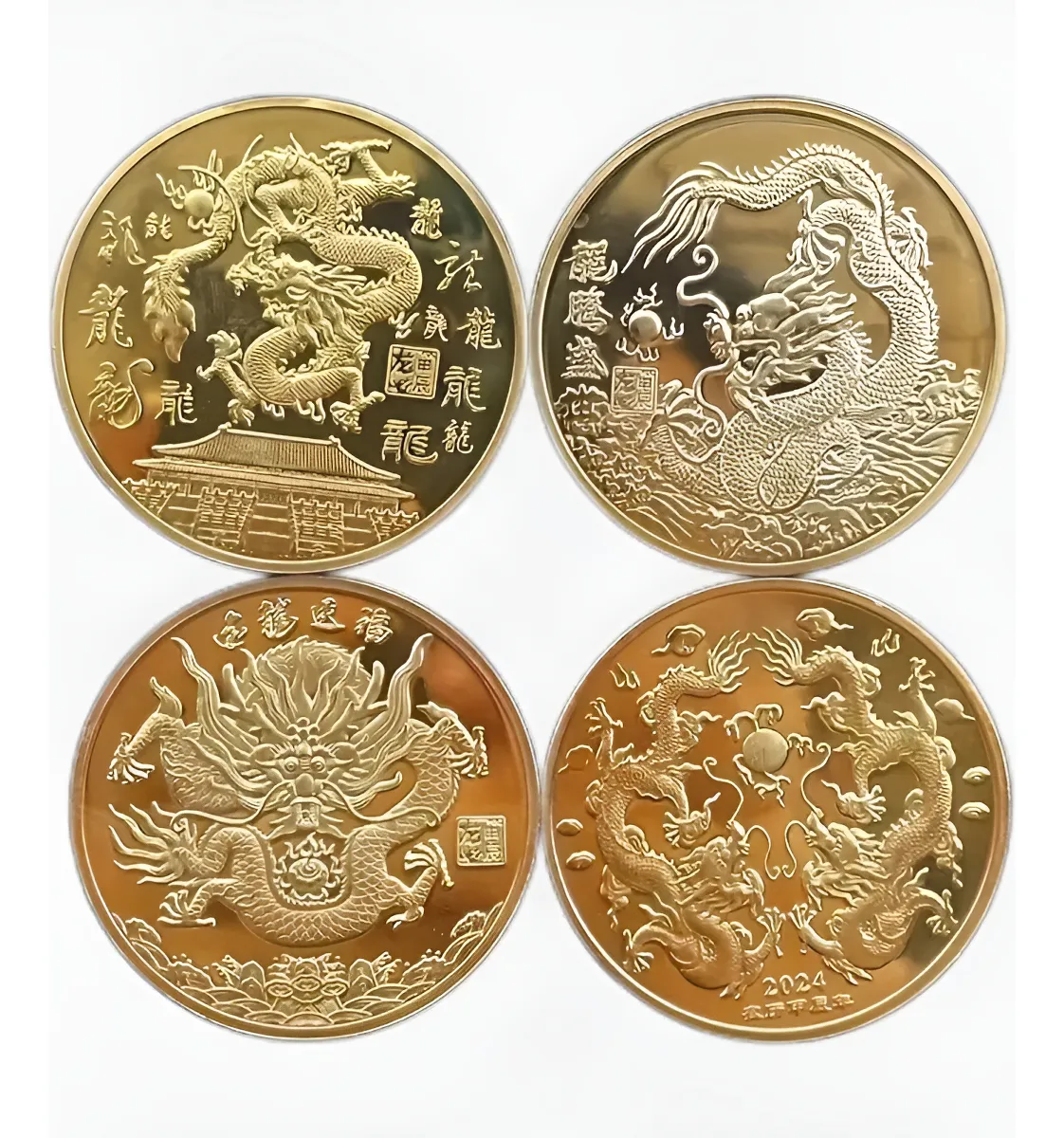 Segundo lote de 4 monedas chinas con dragones imperiales distintos, a elegir. el precio es por unidad,Complemento perfecto para colección oriental.bañadas en oro 24k.