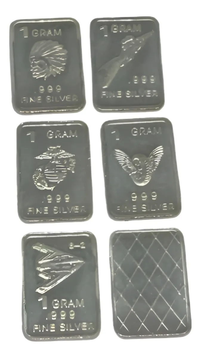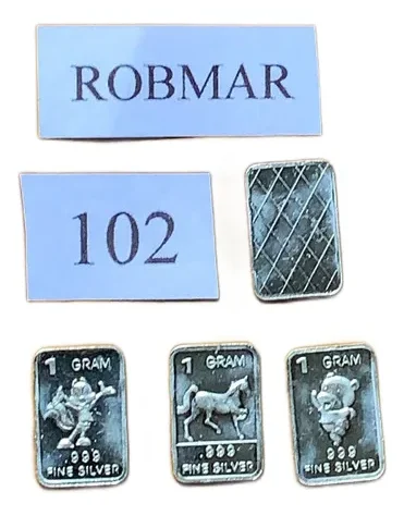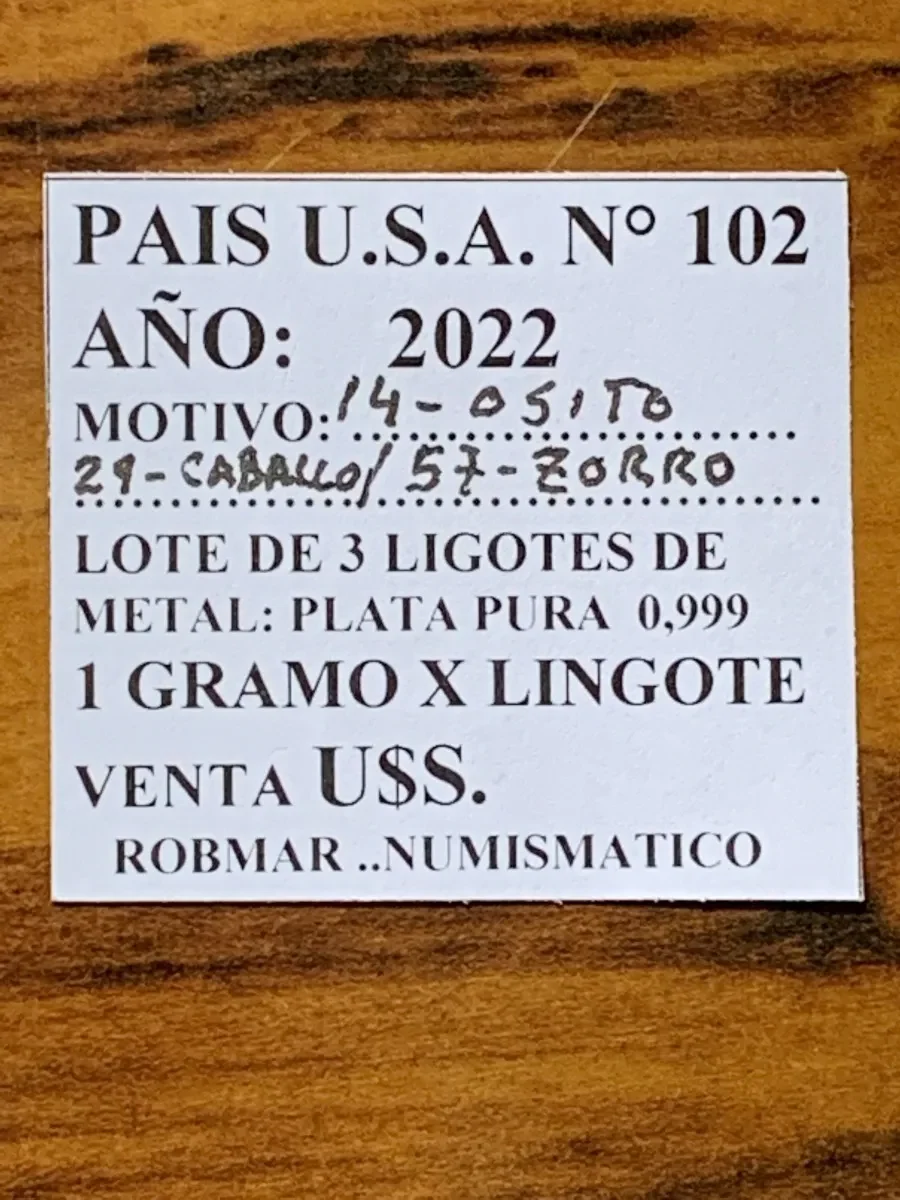 Robmar-U.S.A.-Lote de 5 lingotes x 1 gramo de plata pura 0,999-N°102-total 5 gramos, son 5 motivos diferentes en cada lote ,-este producto de origen de una refinerĂa USA disponemos de muchos motivos en lote de diferentes, animales, armas, personajes, etc, numerados, ideal para coleccionar e invertir porque la plata aumenta en dĂłlares por lo tanto, es mejor que tener dĂłlares asi si aumenta el dĂłlar y aumenta la plata protege mejor su inversiĂłn a futuro además por su tamaño y precio hace accesible su venta en caso de necesidad, tambiĂ©n están en esta página en lingotes por unidad numerados del 1 al 130 y lotes de 3 Y de 5 unidades con motivos variados, al comprar estos lotes vera que el costo dividido por gramo le saldrá más econĂłmico cada gramo, de regalo se adjunta un listado de todos los motivos del 1 al 130 numerados , más la historia de la refinerĂa de estados unidos que los fabrico de lo que hace y detalles de ella como un certificado más y protegidos con capsula plástica y con una descripciĂłn de su contenido