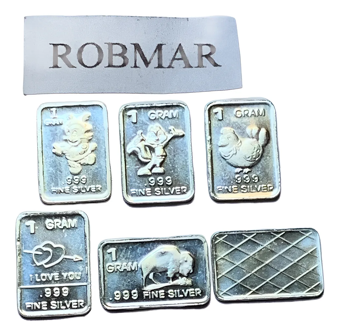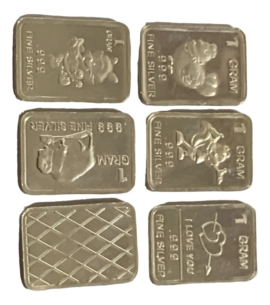 Robmar-U.S.A.-Lote de 5 lingotes x 1 gramo de plata pura 0,999-N°217-total 5 gramos, son 5 motivos diferentes en cada lote ,-este producto de origen de una refinerĂa USA disponemos de muchos motivos en lote de diferentes, animales, armas, personajes, etc, numerados, ideal para coleccionar e invertir porque la plata aumenta en dĂłlares por lo tanto, es mejor que tener dĂłlares asi si aumenta el dĂłlar y aumenta la plata protege mejor su inversiĂłn a futuro además por su tamaño y precio hace accesible su venta en caso de necesidad, tambiĂ©n están en esta página en lingotes por unidad numerados del 1 al 130 y lotes de 3 Y de 5 unidades con motivos variados, al comprar estos lotes vera que el costo dividido por gramo le saldrá más econĂłmico cada gramo, de regalo se adjunta un listado de todos los motivos del 1 al 130 numerados , más la historia de la refinerĂa de estados unidos que los fabrico de lo que hace y detalles de ella como un certificado más y protegidos con capsula plástica y con una descripciĂłn de su contenido