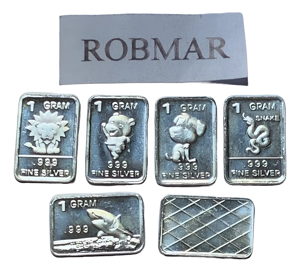 Robmar-U.S.A.-Lote de 5 lingotes x 1 gramo de plata pura 0,999-N°224-total 5 gramos, son 5 motivos diferentes en cada lote ,-este producto de origen de una refinerĂa USA disponemos de muchos motivos en lote de diferentes, animales, armas, personajes, etc, numerados, ideal para coleccionar e invertir porque la plata aumenta en dĂłlares por lo tanto, es mejor que tener dĂłlares asi si aumenta el dĂłlar y aumenta la plata protege mejor su inversiĂłn a futuro además por su tamaño y precio hace accesible su venta en caso de necesidad, tambiĂ©n están en esta página en lingotes por unidad numerados del 1 al 130 y lotes de 3 Y de 5 unidades con motivos variados, al comprar estos lotes vera que el costo dividido por gramo le saldrá más econĂłmico cada gramo, de regalo se adjunta un listado de todos los motivos del 1 al 130 numerados , más la historia de la refinerĂa de estados unidos que los fabrico de lo que hace y detalles de ella como un certificado más y protegidos con capsula plástica y con una descripciĂłn de su contenido