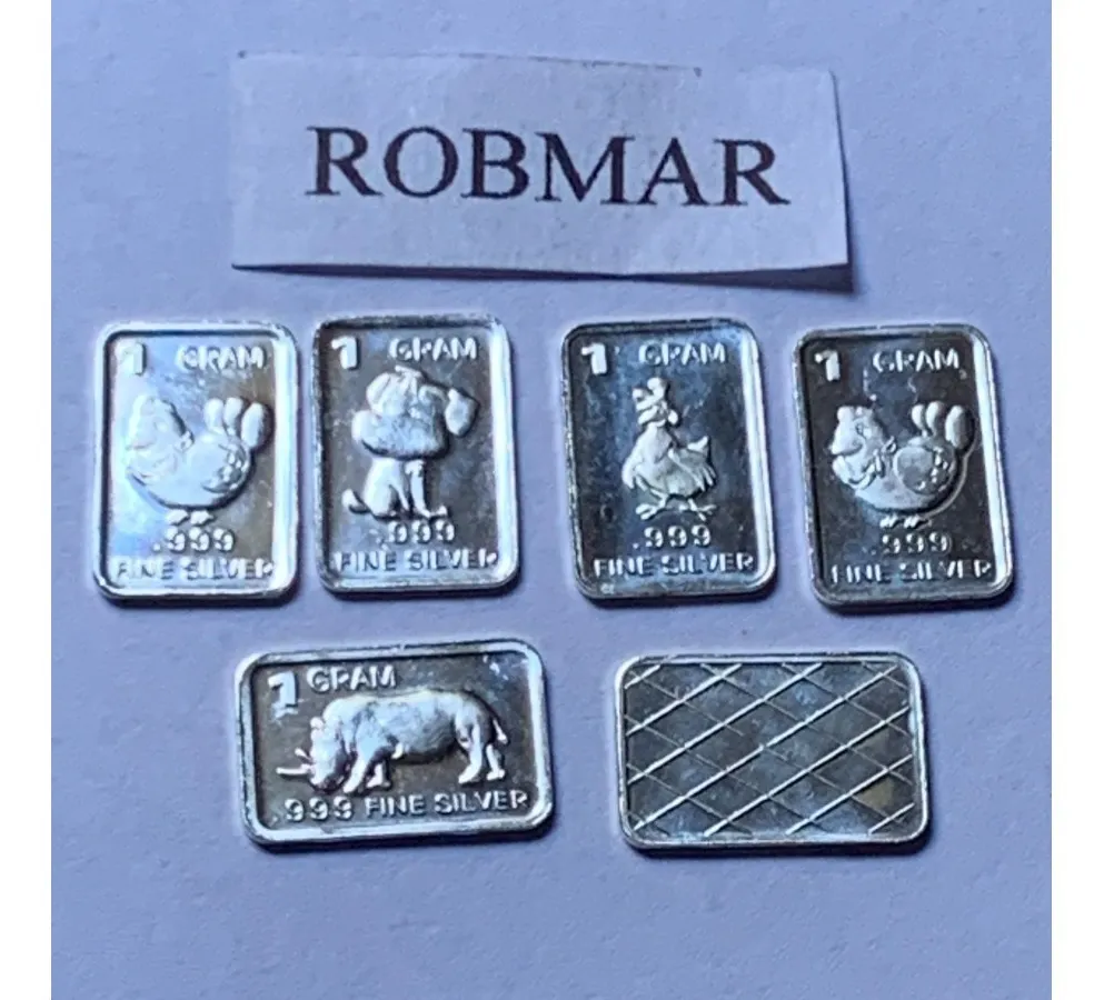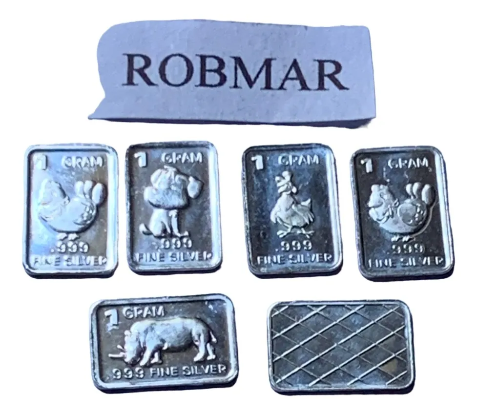 Robmar-U.S.A.-Lote de 5 lingotes x 1 gramo de plata pura 0,999-N°227-total 5 gramos, son 5 motivos diferentes en cada lote ,-este producto de origen de una refinerĂa USA disponemos de muchos motivos en lote de diferentes, animales, armas, personajes, etc, numerados, ideal para coleccionar e invertir porque la plata aumenta en dĂłlares por lo tanto, es mejor que tener dĂłlares asi si aumenta el dĂłlar y aumenta la plata protege mejor su inversiĂłn a futuro además por su tamaño y precio hace accesible su venta en caso de necesidad, tambiĂ©n están en esta página en lingotes por unidad numerados del 1 al 130 y lotes de 3 Y de 5 unidades con motivos variados, al comprar estos lotes vera que el costo dividido por gramo le saldrá más econĂłmico cada gramo, de regalo se adjunta un listado de todos los motivos del 1 al 130 numerados , más la historia de la refinerĂa de estados unidos que los fabrico de lo que hace y detalles de ella como un certificado más y protegidos con capsula plástica y con una descripciĂłn de su contenido