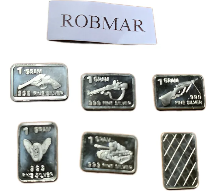 Pack de 5 lingotes Robmar, cada uno de 1g plata 24k, calidad certificada y presentaciĂłn profesional. Ideal para coleccionistas y quienes buscan diversificar su patrimonio en metales nobles.
