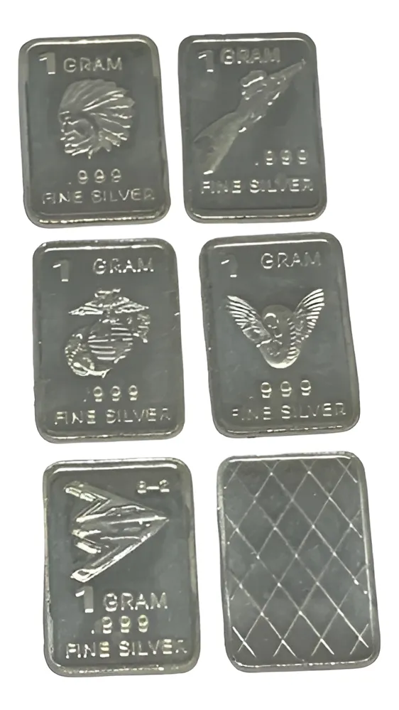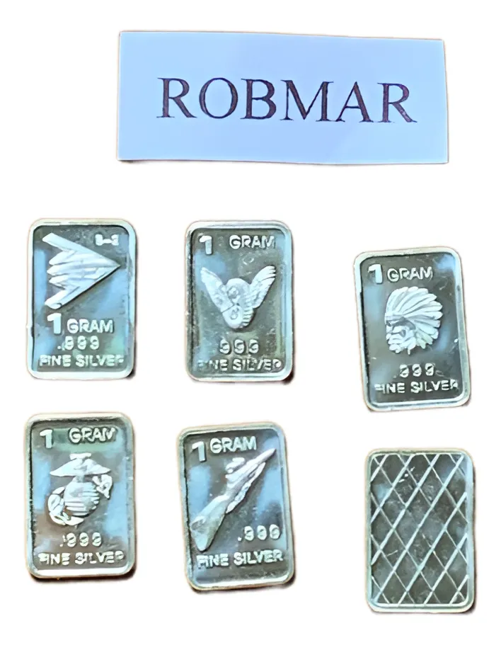 Robmar-U.S.A.-Lote de 5 lingotes x 1 gramo de plata pura 0,999-N°209-total 5 gramos, son 5 motivos diferentes en cada lote ,-este producto de origen de una refinería USA disponemos de muchos motivos en lote de diferentes, animales, armas, personajes, etc, numerados, ideal para coleccionar e invertir porque la plata aumenta en dólares por lo tanto, es mejor que tener dólares asi si aumenta el dólar y aumenta la plata protege mejor su inversión a futuro además por su tamaño y precio hace accesible su venta en caso de necesidad, también están en esta página en lingotes por unidad numerados del 1 al 130 y lotes de 3 Y de 5 unidades con motivos variados, al comprar estos lotes vera que el costo dividido por gramo le saldrá más económico cada gramo, de regalo se adjunta un listado de todos los motivos del 1 al 130 numerados , más la historia de la refinería de estados unidos que los fabrico de lo que hace y detalles de ella como un certificado más y protegidos con capsula plástica y con una descripción de su contenido