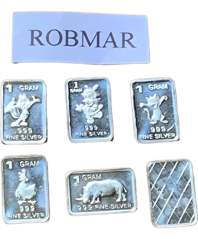 Robmar-U.S.A.-Lote de 5 lingotes x 1 gramo de plata pura 0,999-N°215-total 5 gramos, son 5 motivos diferentes en cada lote ,-este producto de origen de una refinerĂa USA disponemos de muchos motivos en lote de diferentes, animales, armas, personajes, etc, numerados, ideal para coleccionar e invertir porque la plata aumenta en dĂłlares por lo tanto, es mejor que tener dĂłlares asi si aumenta el dĂłlar y aumenta la plata protege mejor su inversiĂłn a futuro además por su tamaño y precio hace accesible su venta en caso de necesidad, tambiĂ©n están en esta página en lingotes por unidad numerados del 1 al 130 y lotes de 3 Y de 5 unidades con motivos variados, al comprar estos lotes vera que el costo dividido por gramo le saldrá más econĂłmico cada gramo, de regalo se adjunta un listado de todos los motivos del 1 al 130 numerados , más la historia de la refinerĂa de estados unidos que los fabrico de lo que hace y detalles de ella como un certificado más y protegidos con capsula plástica y con una descripciĂłn de su contenido