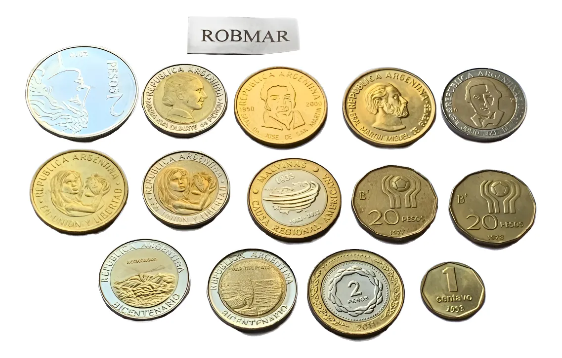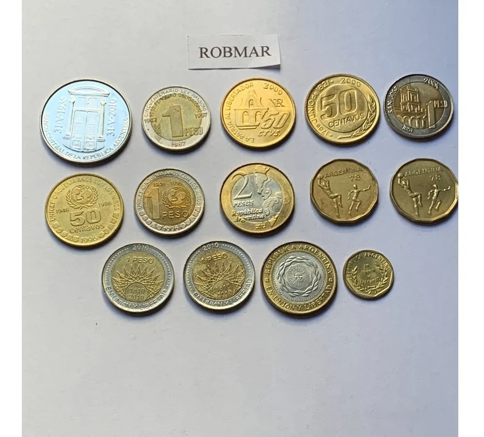 Conjunto de 14 monedas conmemorativas argentinas, nĂşmeros 1 y 2 pesos, colecciĂłn amplia con piezas oficiales que aumentan su valor patrimonial y de mercado.para completar su coleccion o canje