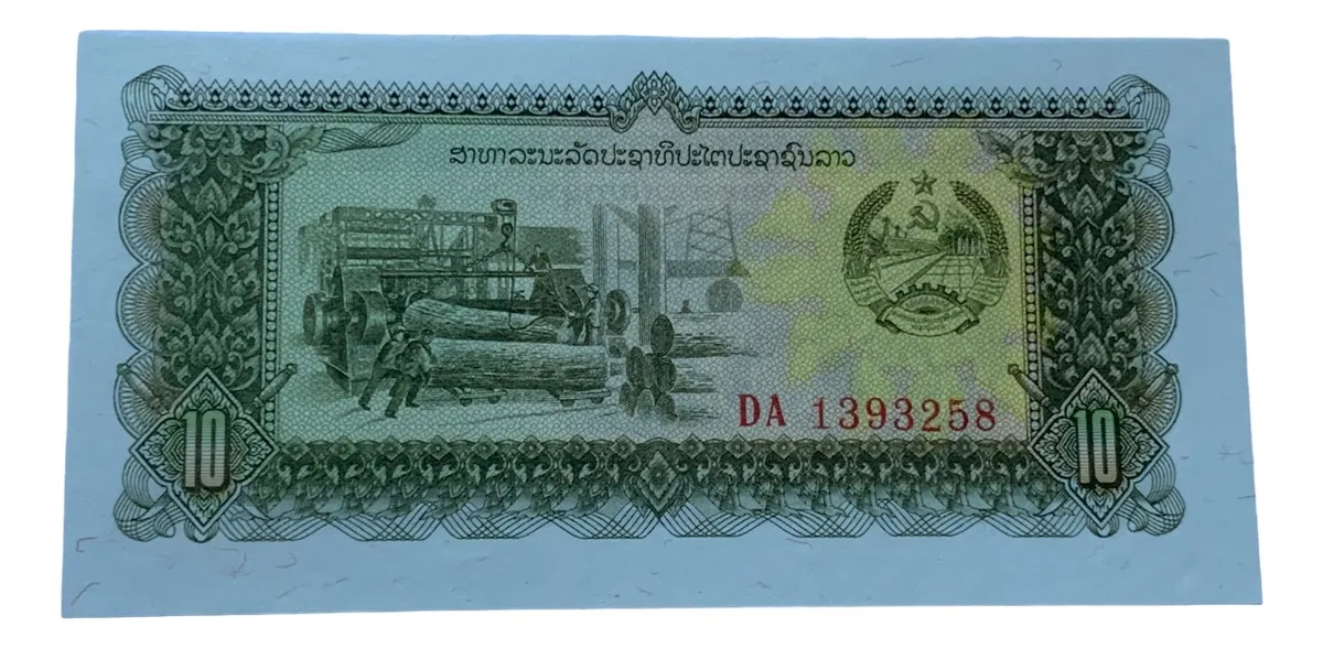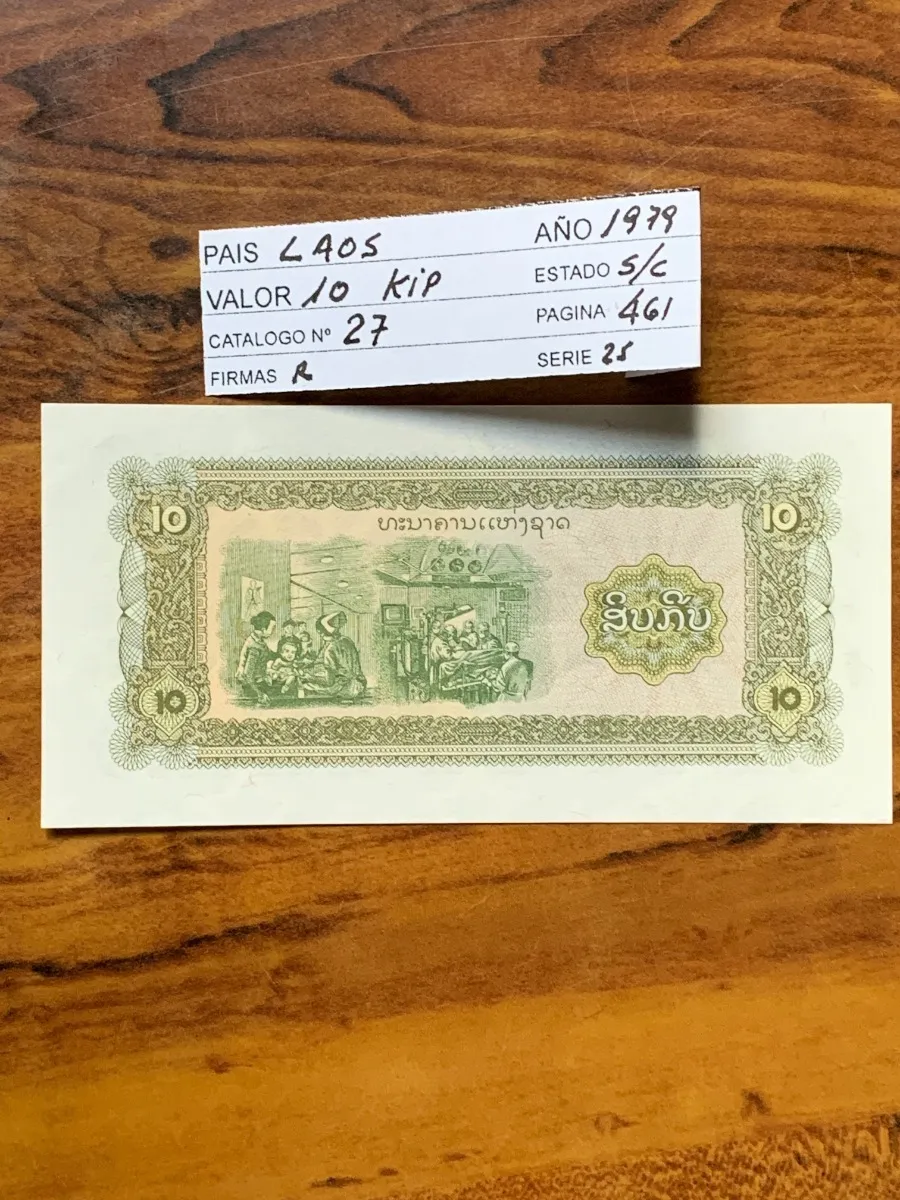Billete de 10 kip laosiano de 1979, con ilustraciones representativas de la cultura rural y la economÃa socialista. Su estado sin circular garantiza atractivo en el mercado internacional de coleccionismo.sin circular