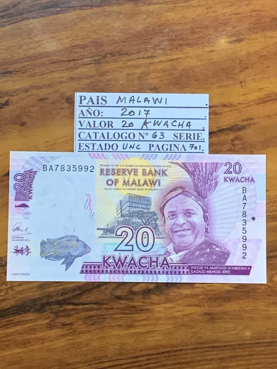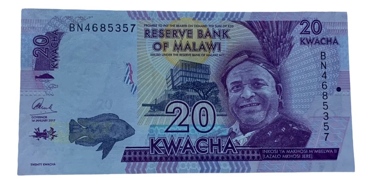 Billete contemporáneo de 20 kwacha de Malawi, con detalles modernos y figuras nacionales. Su estado sin circular y reciente emisión lo vuelven una opción fiable para coleccionistas con visión de futuro.-sin circular