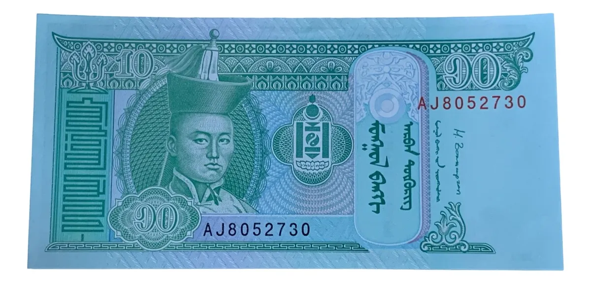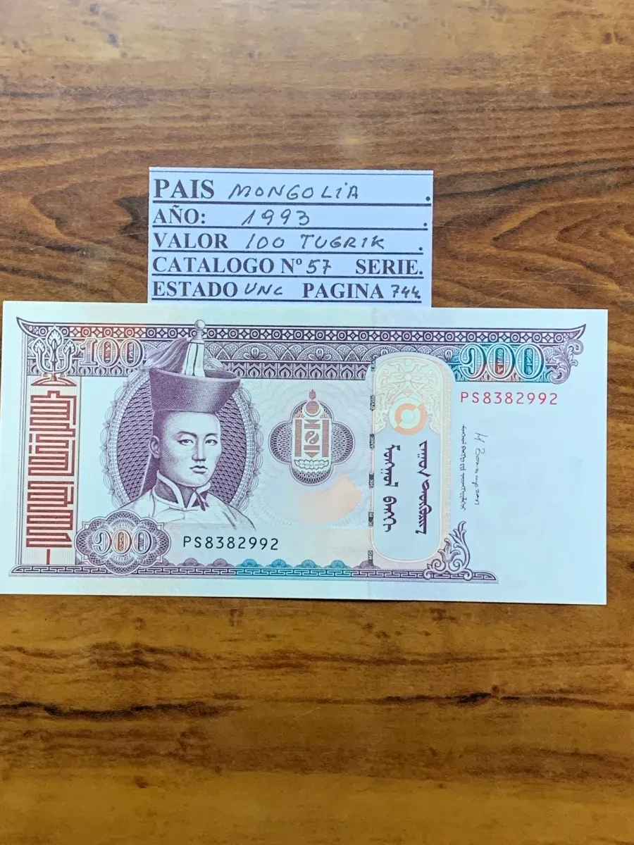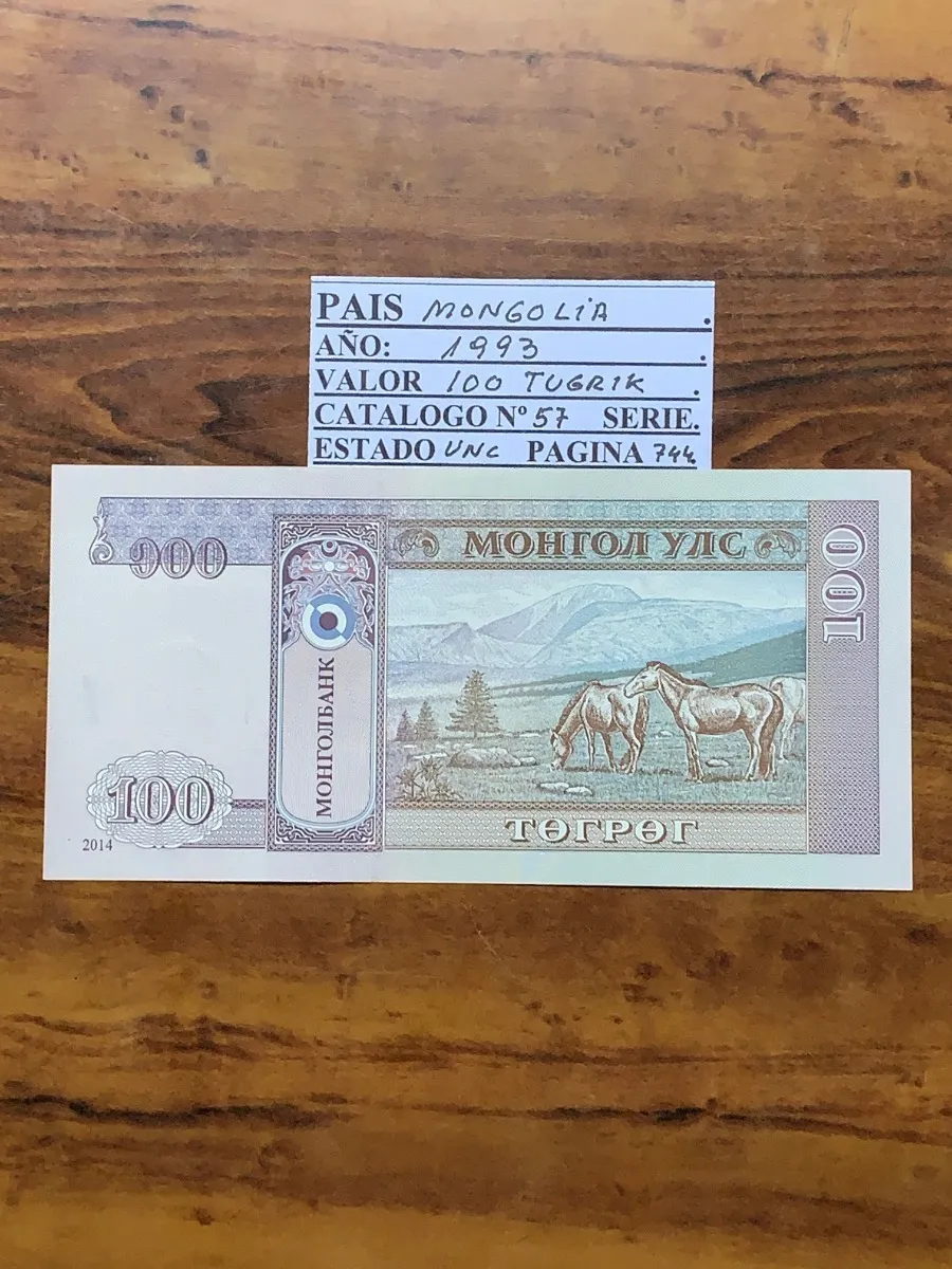 Una pieza de Mongolia de alto valor nominal, este billete de 100 tugrik de 1993 integra ilustraciones de paisajes y personajes emblemáticos. Es buscado por su atractivo estético y contexto post-socialista.-sin circular