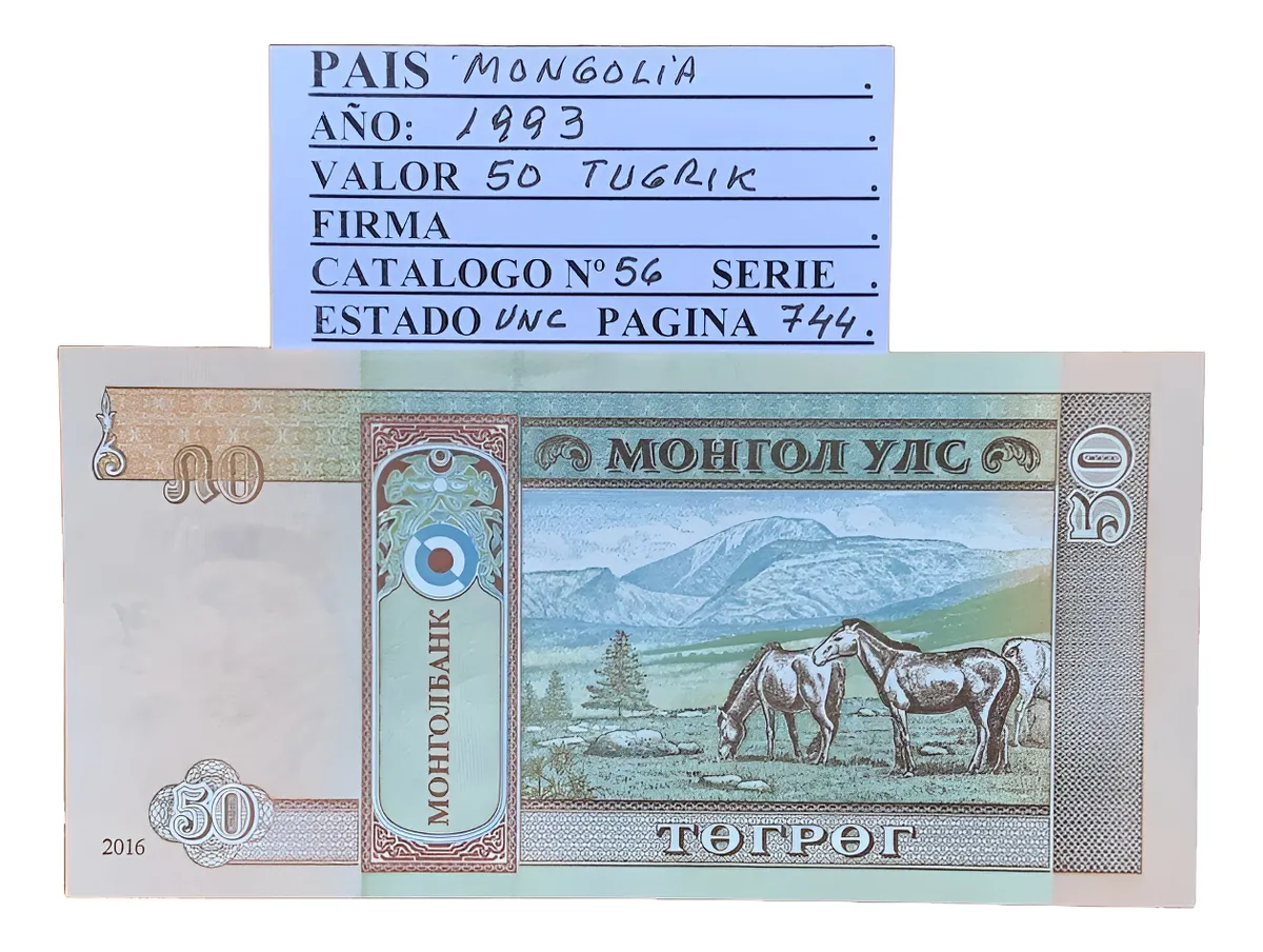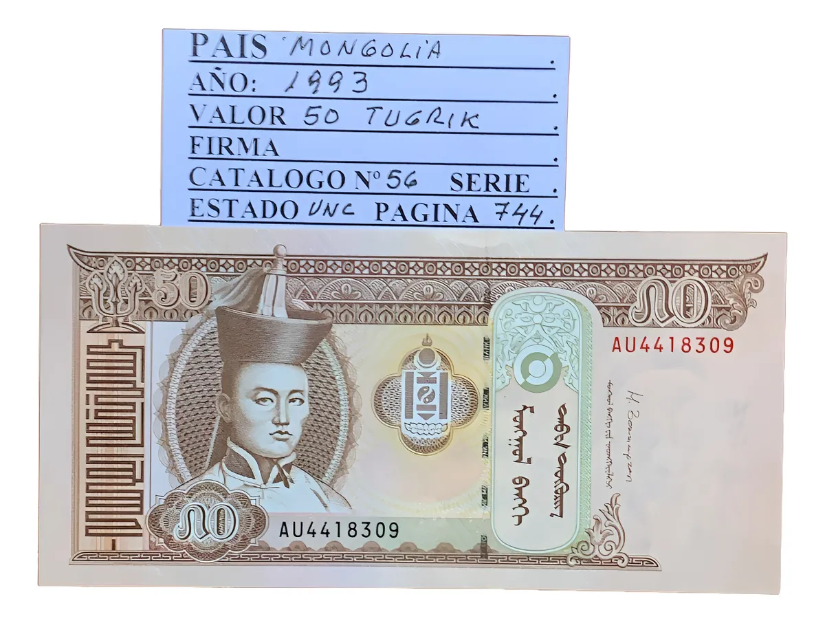 Billete de 50 tugrik del mismo perÃodo de Mongolia, relevante para completar series históricas y explorar cambios económicos tras la apertura democrática.