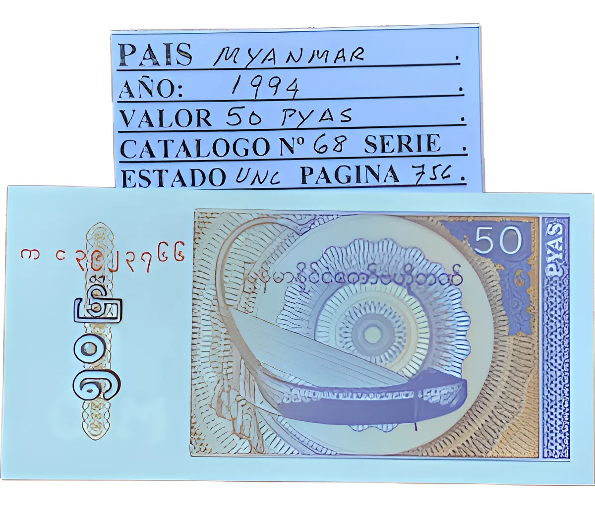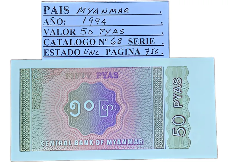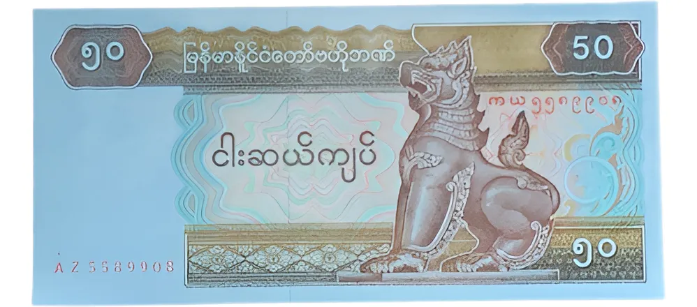 Billete sin circular de 50 kyats emitido en Myanmar en 1994, destaca por el león Chinthe sentado en el anverso, representando la protección y poder nacional. La serie refleja la transición de la economÃa birmana en la década de los noventa, y es apreciada por su iconografÃa y conservación.-sin circular