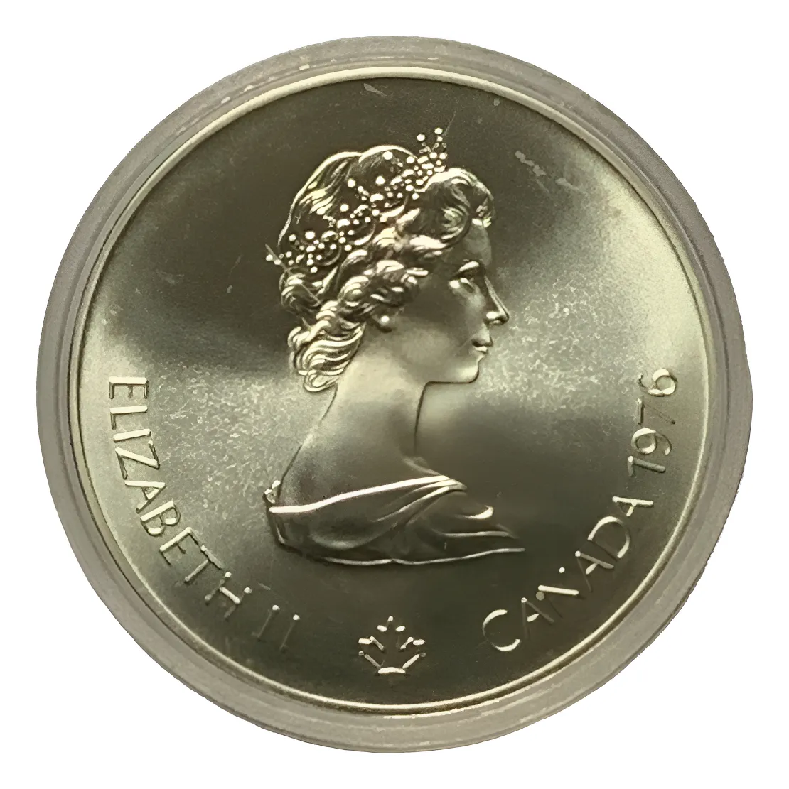 Moneda Canadá 5 dólares 1976, 24,3 g plata 0,999 (serie Montreal). Olímpica de alta pureza con baño 24k.hay publicados tambien varios motivos olimpicos de esta serie de 10 dolares y de 48 gramos de plata pura 24k.