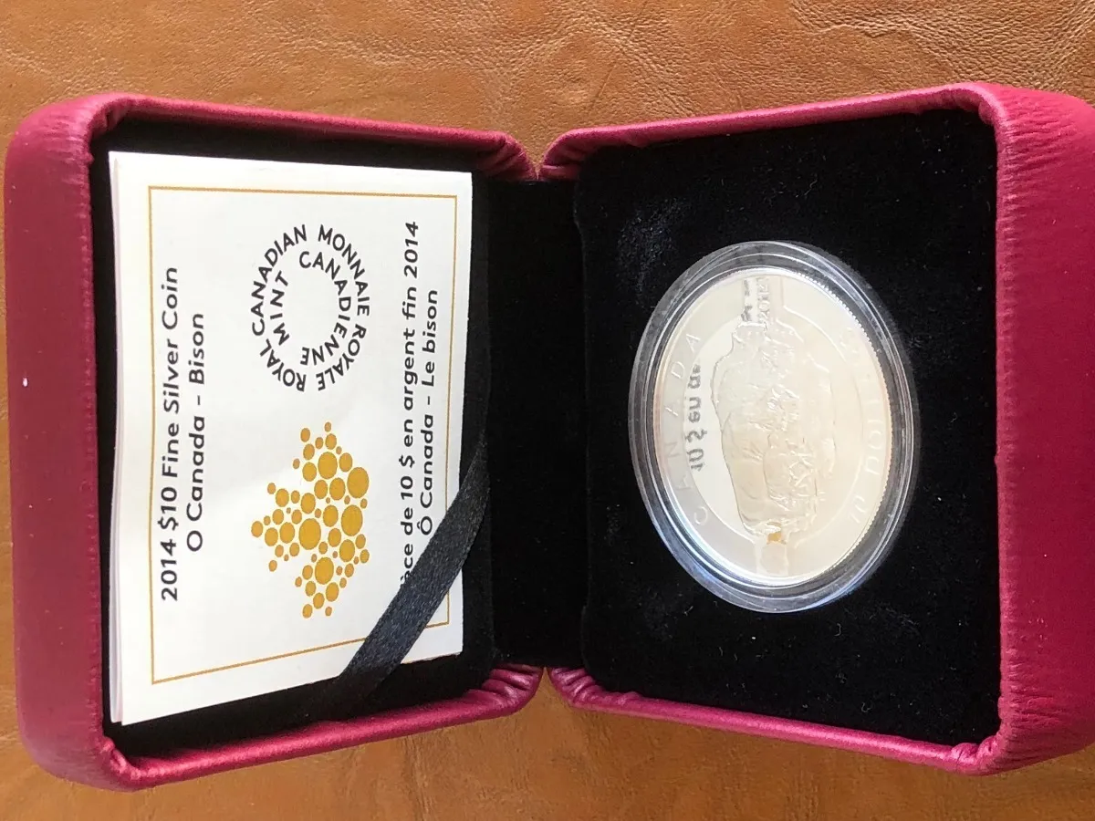Estuche Rojo Acolchado con Moneda de Canadá de 10 dolares proof (brillo espejo) 1/2 oz plata muy pura 0,9999 con el motivo de «el Bisonte» edición año 2014.directo de la casa de moneda de Canada dentro lleva el certificado de autenticidad
