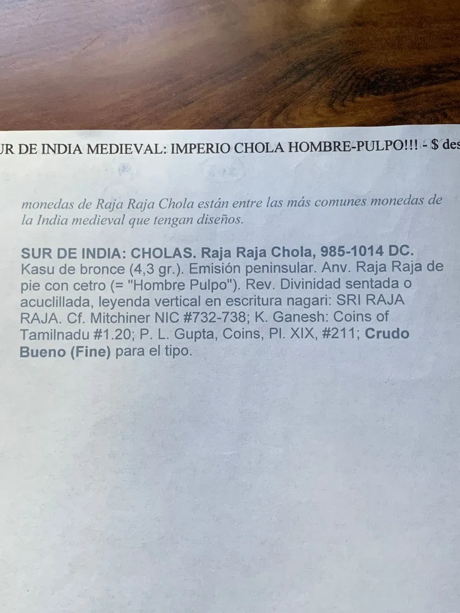 Moneda medieval del sur de India, dinastía Chola de Thanjavur (ca. 985–1014 d.C.). Pieza exótica muy buscada por coleccionistas de India antigua y medieval.,muy rara y antigua, de una dinastia estinguidad que vivia en la antigua india, es un pedazo de historia que es digno de tener en cualquier coleccion, profesor o historiador