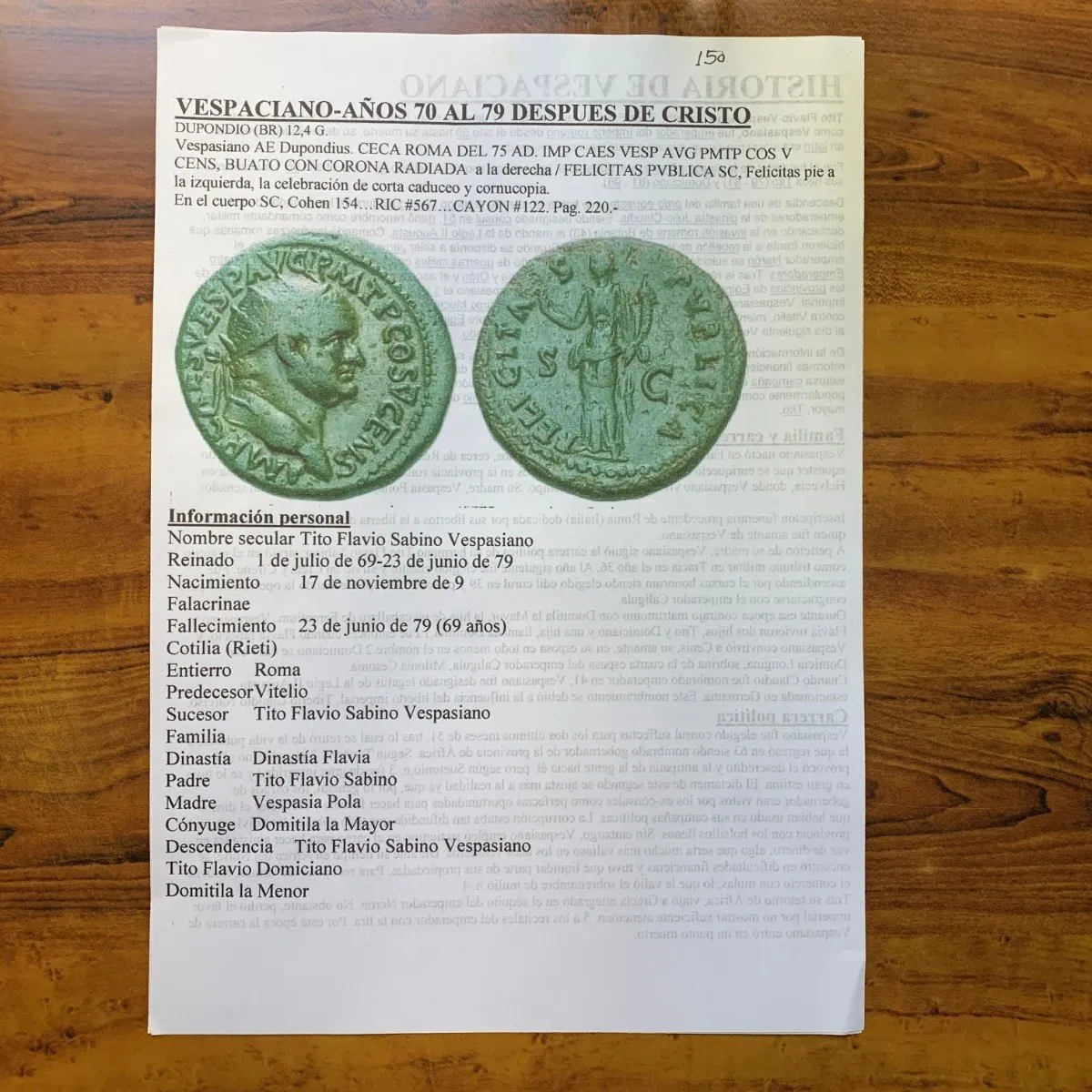 Dupondio romano de Vespasiano (70–79 d.C.), bronce de gran módulo. Excelente pieza para coleccionistas del siglo I y la dinastÃa Flavia.​moneda de casi 2000 años de antiguedad para coleccionistas y estudiosos de la era romana, se adjunta como regalo la historia de este emperador de quien fue y lo que iso en su vida, es historia pura en una moneda de buena conservacion por los años que pasaron, todo numismatico o coleccionista de lo antiguo debe tener por lo menos una de estas reliquias antiguas de la civilizacion anterior como viva historia de nuestro planeta
