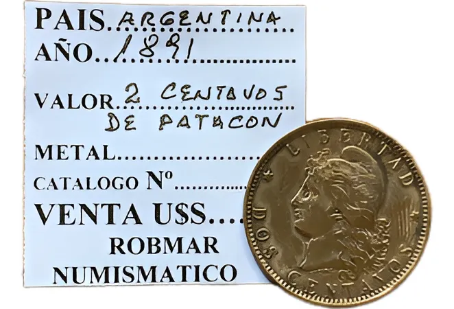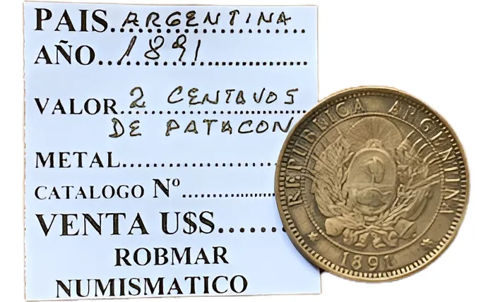 Moneda argentina 2 centavos “patacón” 1891, pieza histórica de finales del siglo XIX. Muy apreciada para colecciones clásicas argentinas. de las primeras monedas emitidas por la republica argentina cuando nacio independiente y valor facial menor al famoso patacon solo se hicieron en 10 años diferentes