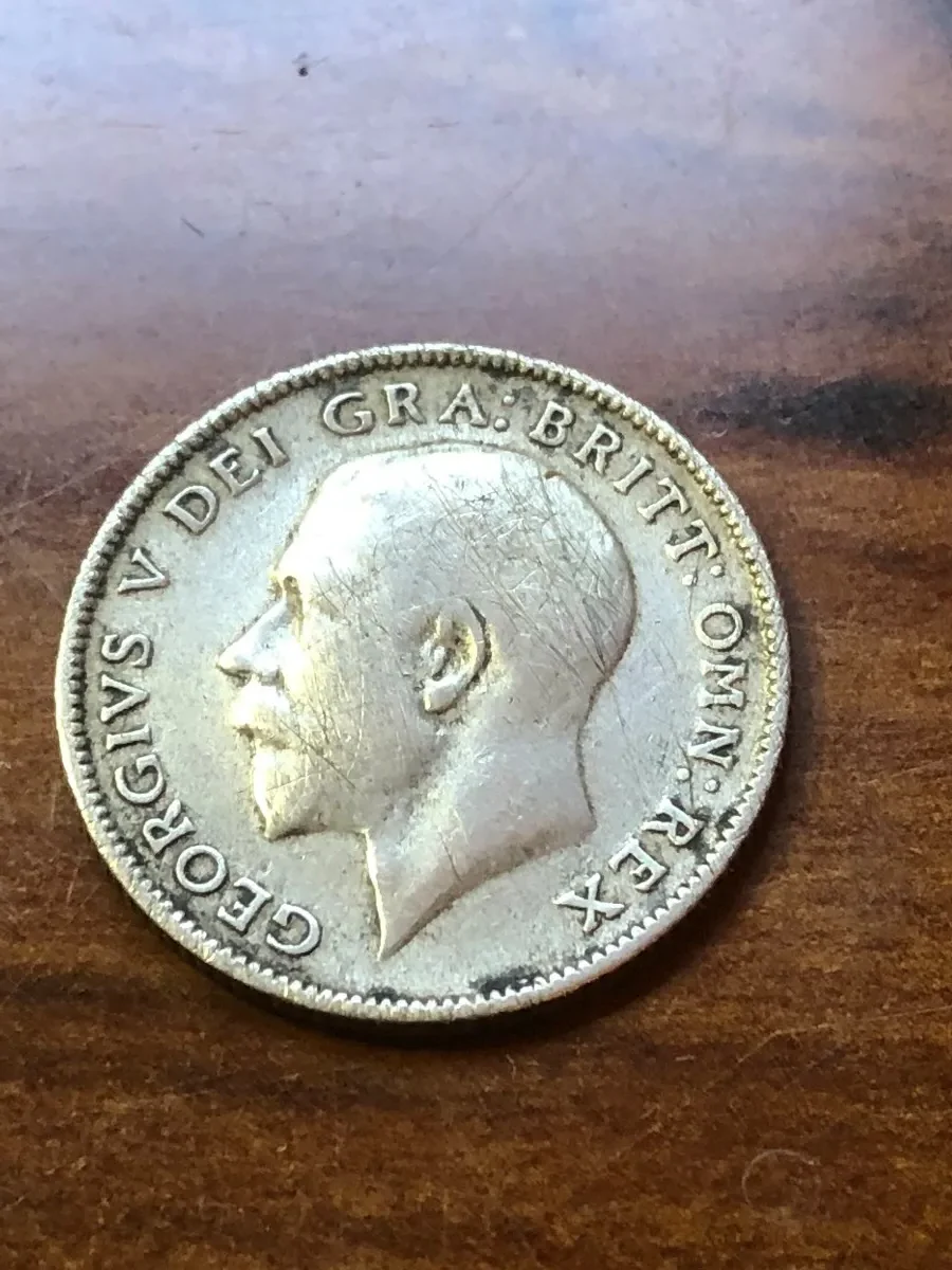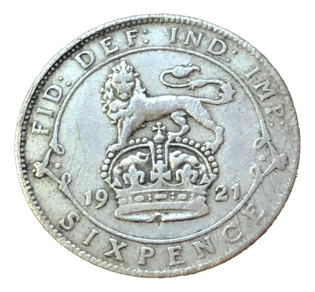 Moneda inglesa 6 pence 1921, plata 0,500, clasificada grado 5. Pieza georgiana pequeña pero histórica.