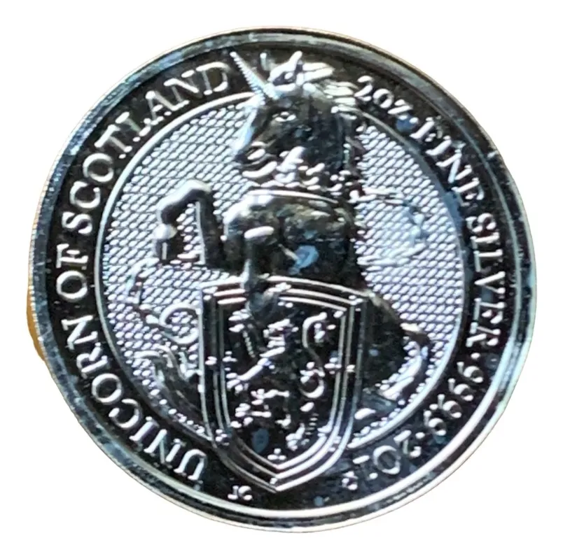 Moneda británica de 2 onzas plata 0,9999, serie The Queen’s Beasts, motivo Unicornio 2018. Pieza de alta pureza y gran tamaño para inversión y colección premium. contiene 62,20 gramos de plata purÃsimas mas que 24 k., e integra la colección llamada LAS BESTIAS DE LA REINA con un dorso de la reina que gobernó durante tantos años en Inglaterra, emitiéndose a partir de esta año, hay en esta pagina mas motivos y años de esta serie, ideal como inversión por el gran contenido de plata que aumenta mas que el dólar, con mucha demanda mundial