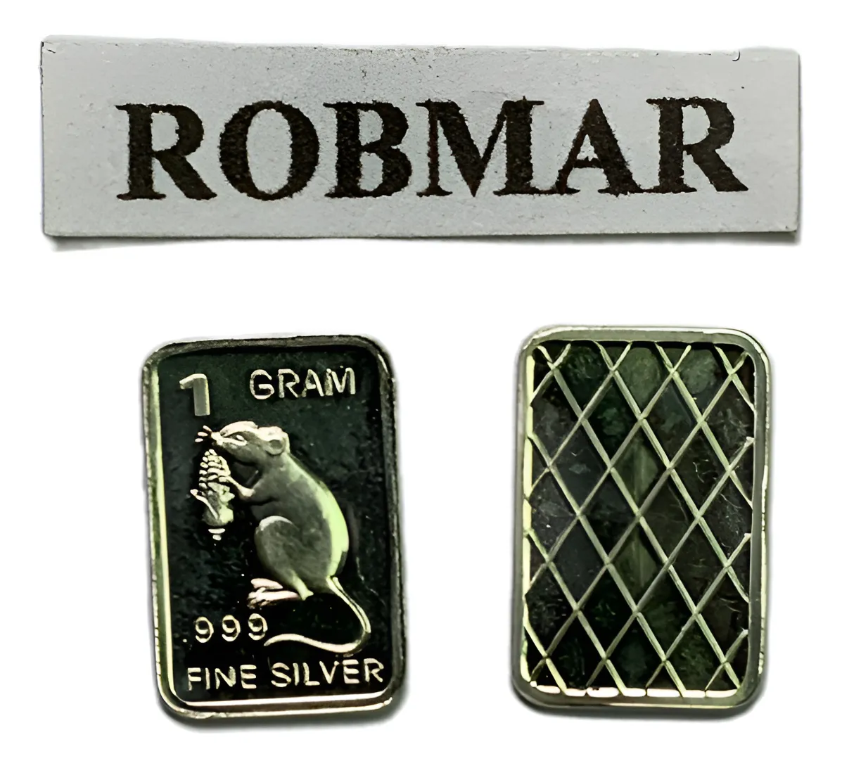 Robmar-U.S.A.-Lingote de 1 gramo de plata pura 0,999-n°18-una rata,-este producto de origen de una refinerĂa USA disponemos de 130 motivos diferentes, animales, armas, personajes, etc, numerados del 1 al 130 ideal para coleccionar e invertir porque la plata aumenta en dĂłlares por lo tanto, es mejor que tener dĂłlares asi si aumenta el dĂłlar y aumenta la plata protege mejor su inversiĂłn a futuro además por su tamaño y precio hace accesible su venta en caso de necesidad, tambiĂ©n están en esta pagina lotes de 3 unidades o de 5 unidades con motivos variados, al comprar estos lotes vera que el costo dividido por gramo le saldrá mas econĂłmico cada gramo, de regalo se adjunta un listado de todos los motivos y nĂşmeros más la historia de la refinerĂa de estados unidos de lo que hace y detalles de ella como un certificado mas
