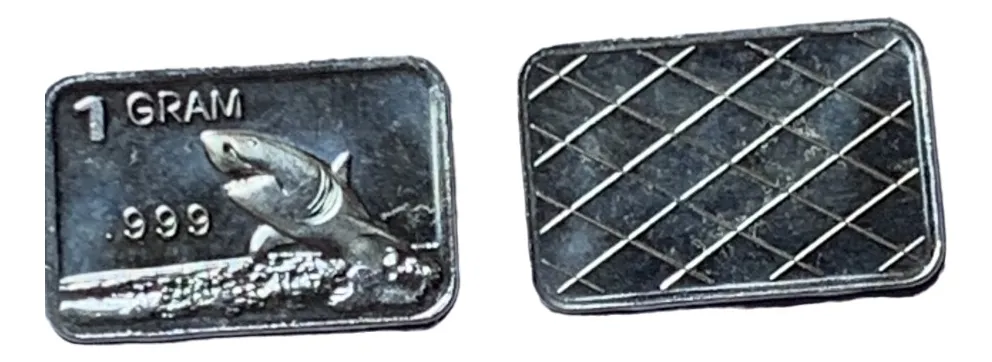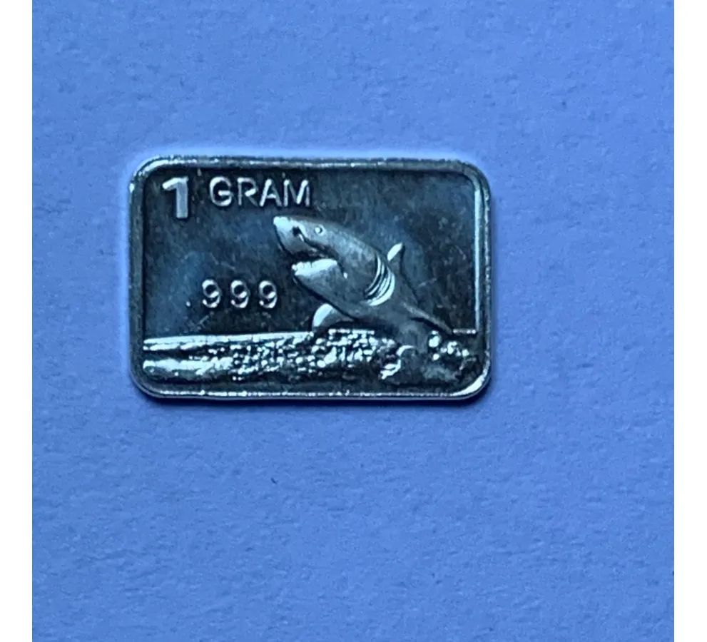 Lingote plata 24k 1g con diseño de tiburón, en estuche 3D exclusivo, ideal para colecciones exóticas y materiales con alto valor.