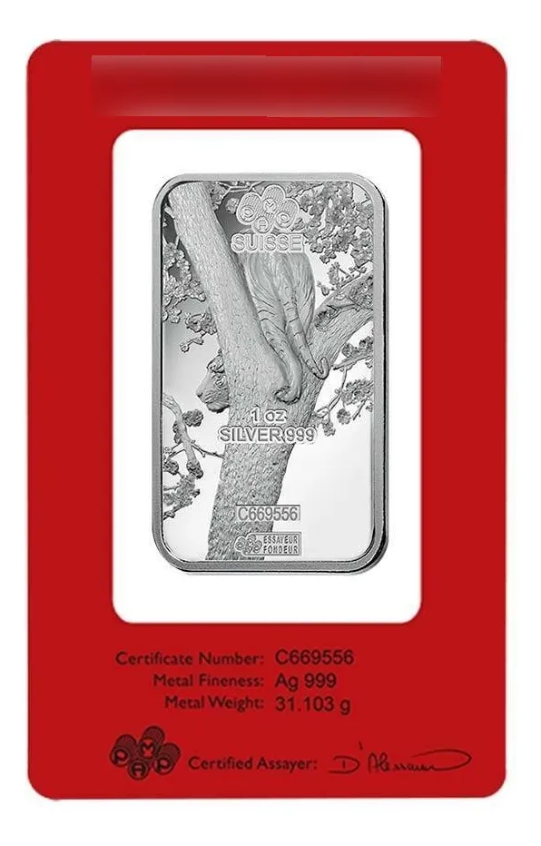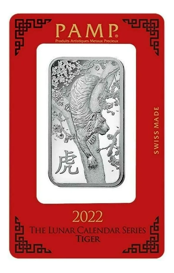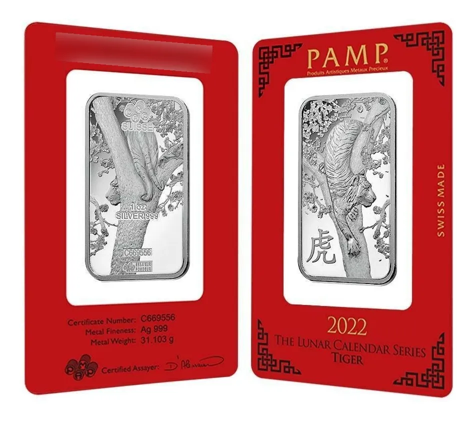 lingote PAMP Suisse de 31,12 gramos plata 24 k. 0,999 con motivo Tigre. Perfecto para completar o sumar pequeñas fracciones de plata de alta confianza. emitida por una de las mejores refinerÃas del mundo PAMP SUISA directa de allÃ, en blÃster sellado y numerado uno por una que confiere una certificación única directa con seguro de autenticidad en su blÃster además como complemento se entrega la historia de dicha refinerÃa como aval adicional de quien la fabrico, de esta forma asegura su pureza para que no la falsifiquen hay copias falsas a menor precios, no perdérsela y asegurar su futuro y coleccione los distintos animales conmemorativos de los signos del zodiaco chino, hay también de 1 onza /31,12 gramos-y de 100 gramos de diferentes animales del año chino en plata u oro 24 k. 0,999 refinerÃa suiza pamp