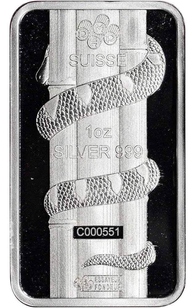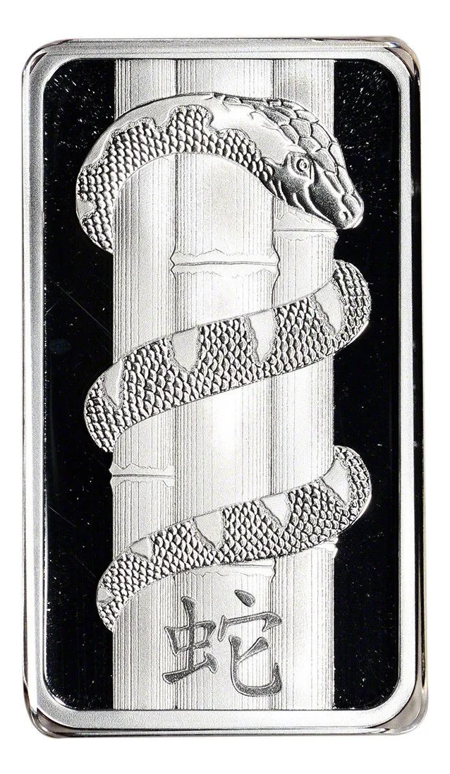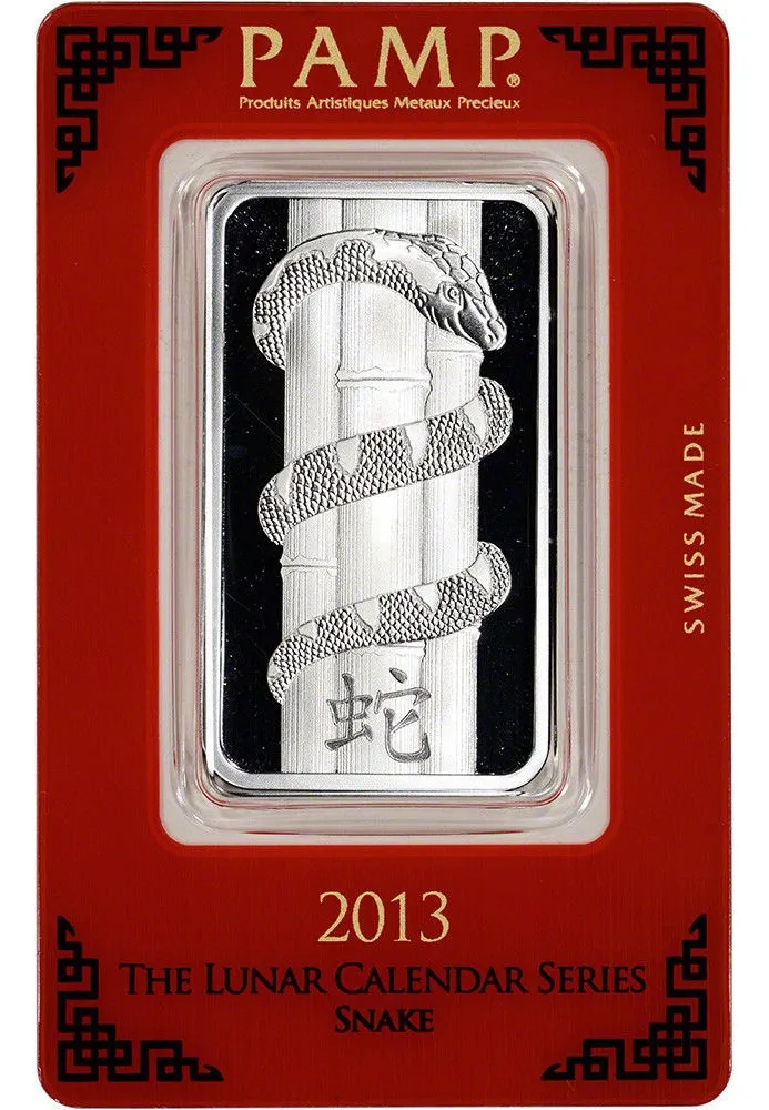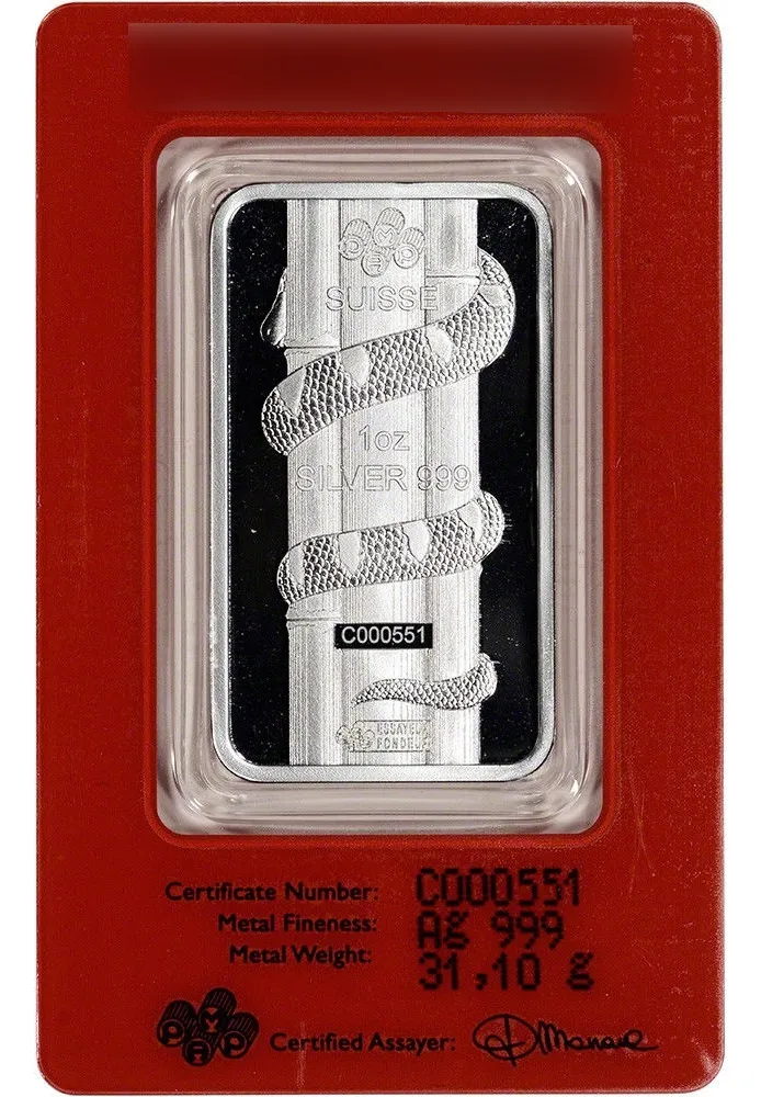 lingote PAMP Suisse de 31,12 gramos plata 24 k. 0,999 con motivo Víbora. Perfecto para completar o sumar pequeñas fracciones de plata de alta confianza. emitida por una de las mejores refinerías del mundo PAMP SUISA directa de allí, en blíster sellado y numerado uno por una que confiere una certificación única directa con seguro de autenticidad en su blíster además como complemento se entrega la historia de dicha refinería como aval adicional de quien la fabrico, de esta forma asegura su pureza para que no la falsifiquen hay copias falsas a menor precios, no perdérsela y asegurar su futuro y coleccione los distintos animales conmemorativos de los signos del zodiaco chino, hay también de 1 onza /31,12 gramos-y de 100 gramos de diferentes animales del año chino en plata u oro 24 k. 0,999 refinería suiza pamp