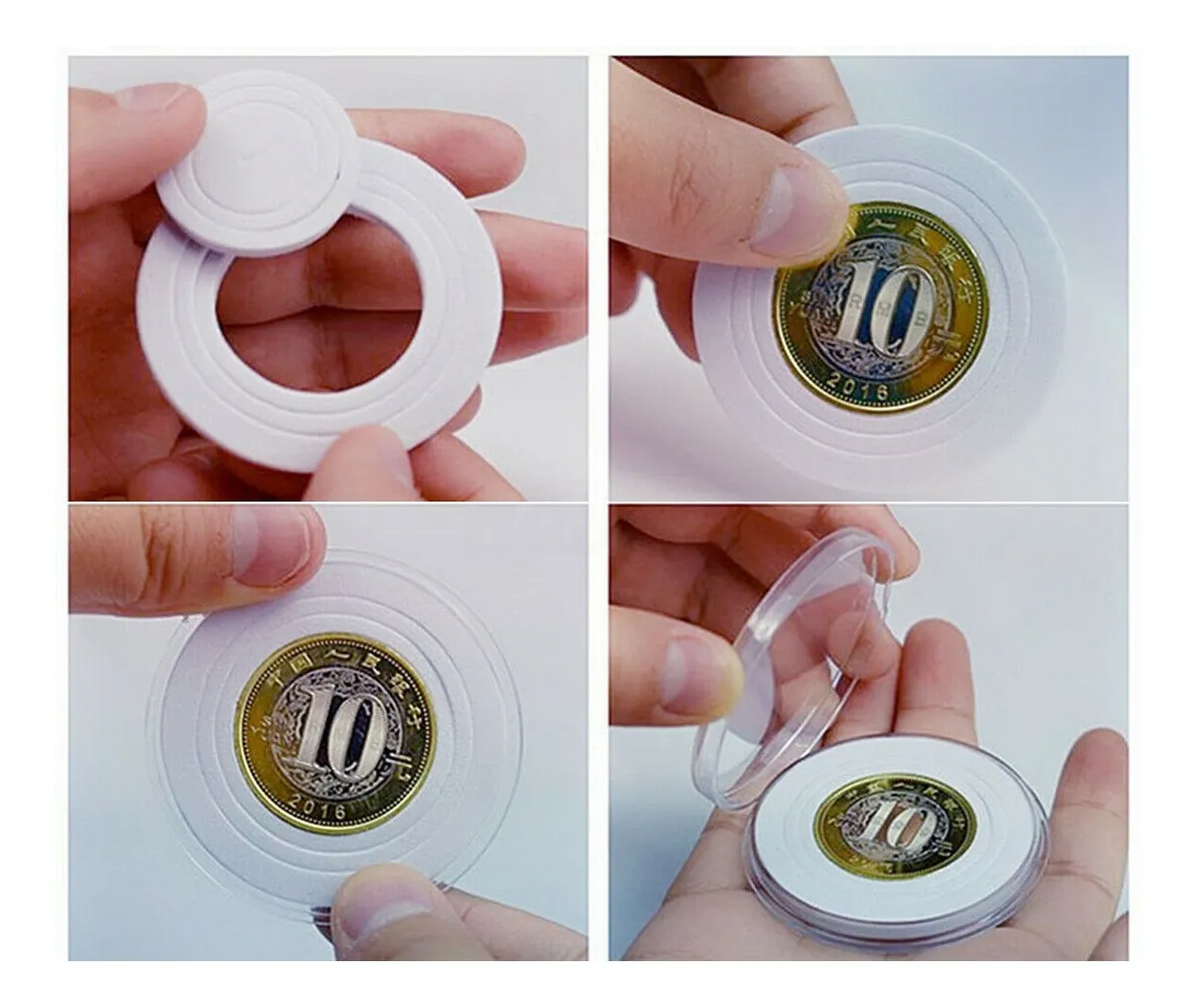 Lote de 10 juegos de aros plásticos de 30 mm.(varias medidas dentro de cada uno) para monedas. Accesorio perfecto para encapsular, centrar y proteger monedas en cápsulas mas grandes, también hay stock de capsulas de varias medidas y lotes de capsulas y aros de 30, de 40 y de 46 mm. de diámetros.