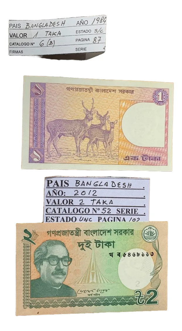 Lote de dos billetes de Bangladesh, de 1 y 2 taka, ejemplificando la pluralidad monetaria del paÃs. Sus diseños incorporan cultura local y sÃmbolos nacionales, siendo perfectos para coleccionistas de billetes exóticos.