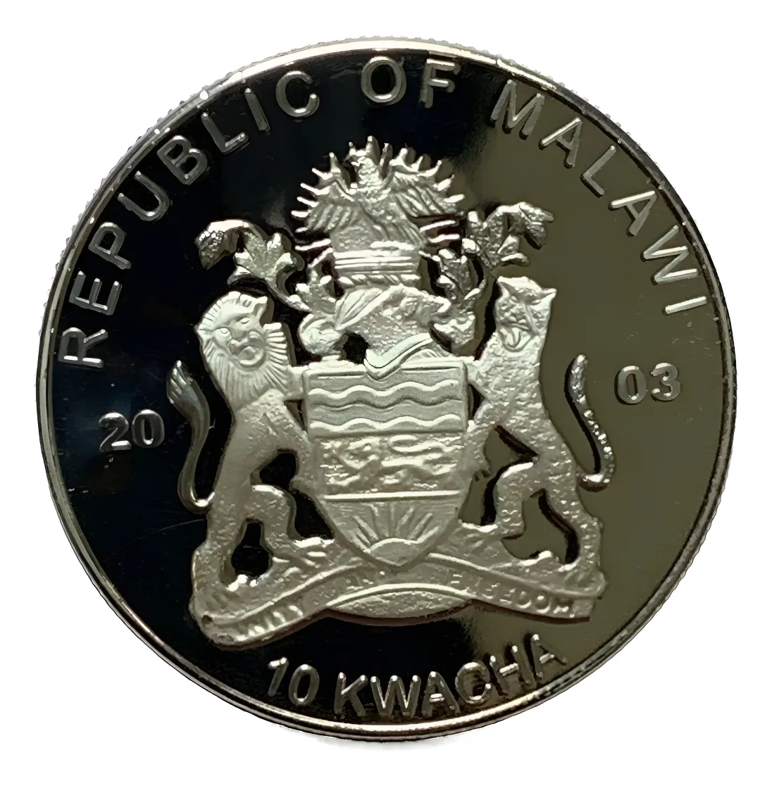 Moneda Malawi 10 kwacha 2003, plata 0,999, homenaje a Juan Pablo II. Pieza africana de colecciĂłn rara en el mercado hispano.–conmemorando la visita del papa en ese pais con su imagen , moneda muy requerida por los cristianos religiosos del mundo apodado EL PAPA BUENO por su carisma y bondad no puede faltar en su coleccion-rara y poca emision