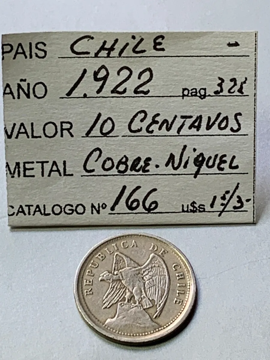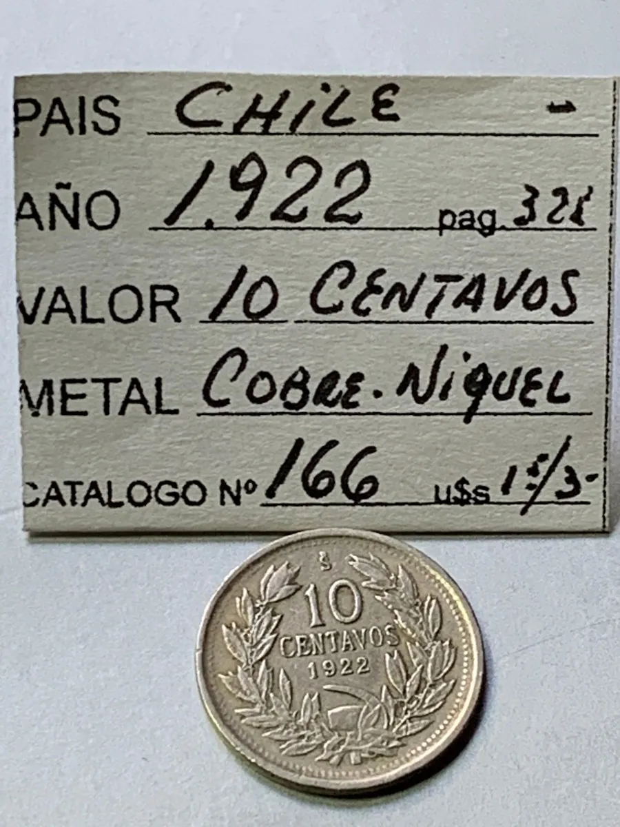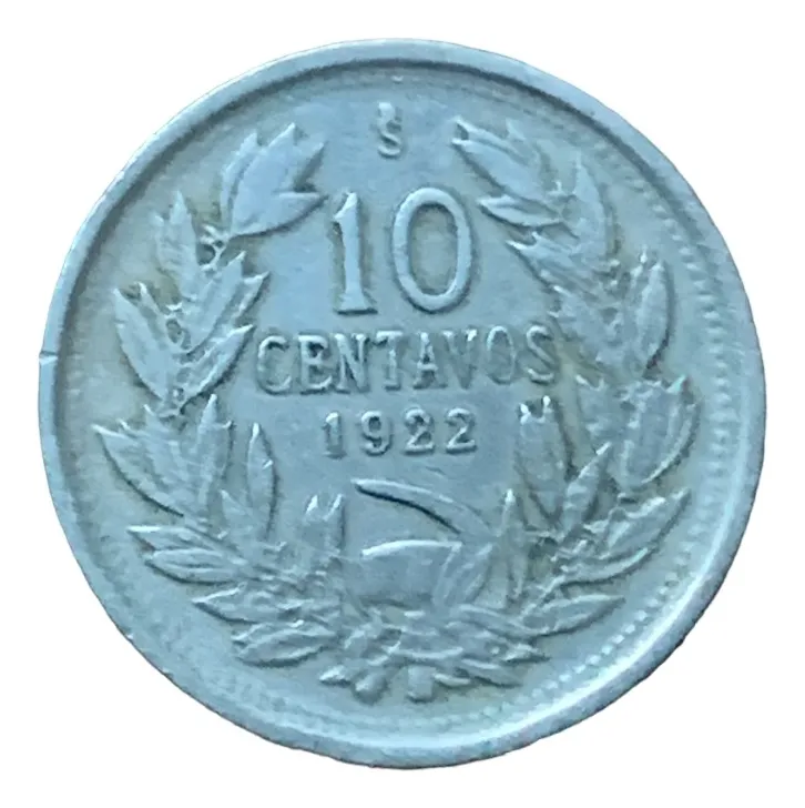 Moneda chilena 10 centavos 1922, KM 166, en cobre‑níquel.clasificada