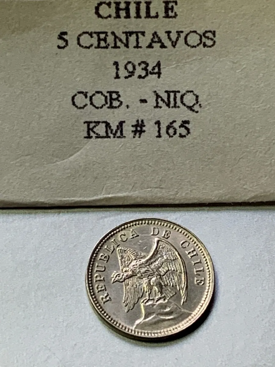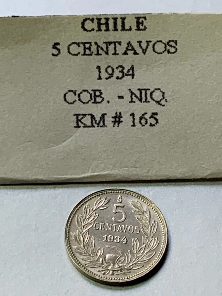 Moneda de Chile 5 centavos 1934, KM 165, cobre‑nÃquel. Pieza histórica sudamericana muy buscada en colecciones de circulación antigua. Excelente opción para coleccionistas de primeras décadas del siglo XX en Latinoamérica.​ si le falta alguna otra de año similar consulte y si la tenemos podrá ir completando su colección por fecha de este valor facial, también tenemos de otros valores faciales si no lo encuentra publicados consulte por si tenemos stock asà va completando la colección chinela por tipo o por año, tenemos mucho stock numismático para ofrecer de distintos paÃses aparte de los publicados​