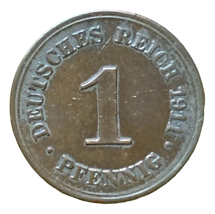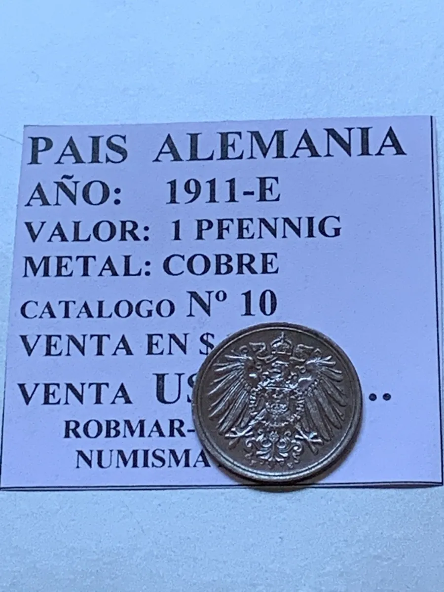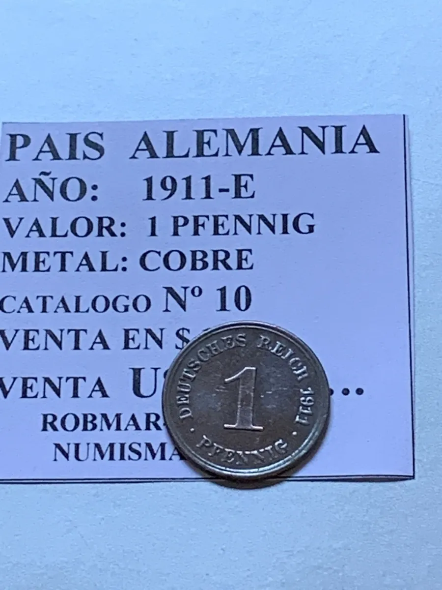 Segundo ejemplar de 1 pfennig 1911-E, KM.10. Útil para comparar grados de conservación o completar varias series.es la numero 10 emitida por alemania,tenemos muchas mas de los diferentes gobiernos y cecas de este pais