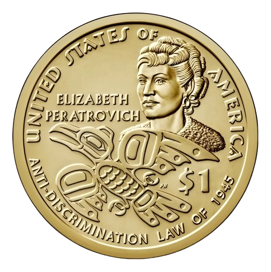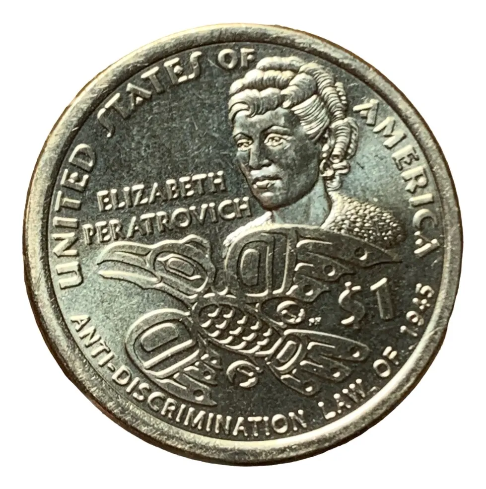 Monedas de 1 dólar de la india sacagawea de los años 202o retrato de Elizabeth Peratrovich lucho contra la anti-descrimination
