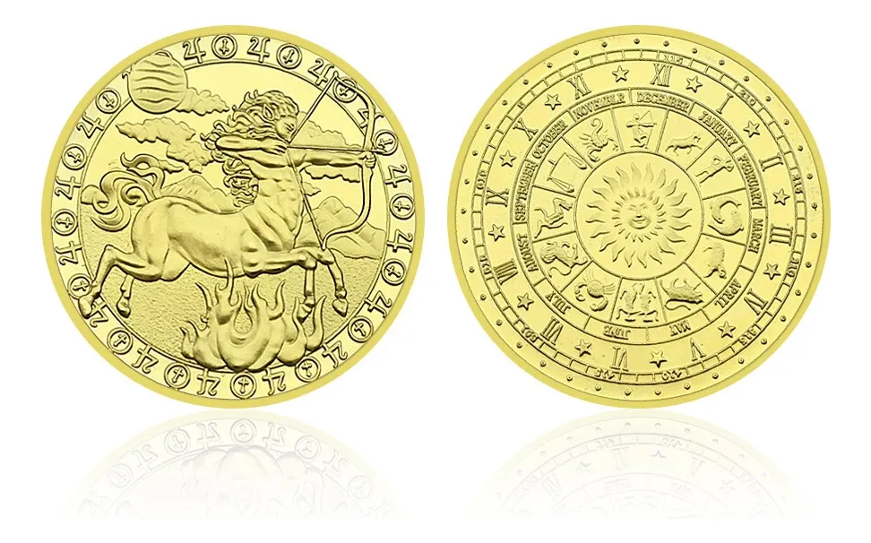 Moneda zodiacal Sagitario bañada oro 24k con arco y flecha. Ideal para fanáticos del horóscopo y regalos personalizados.