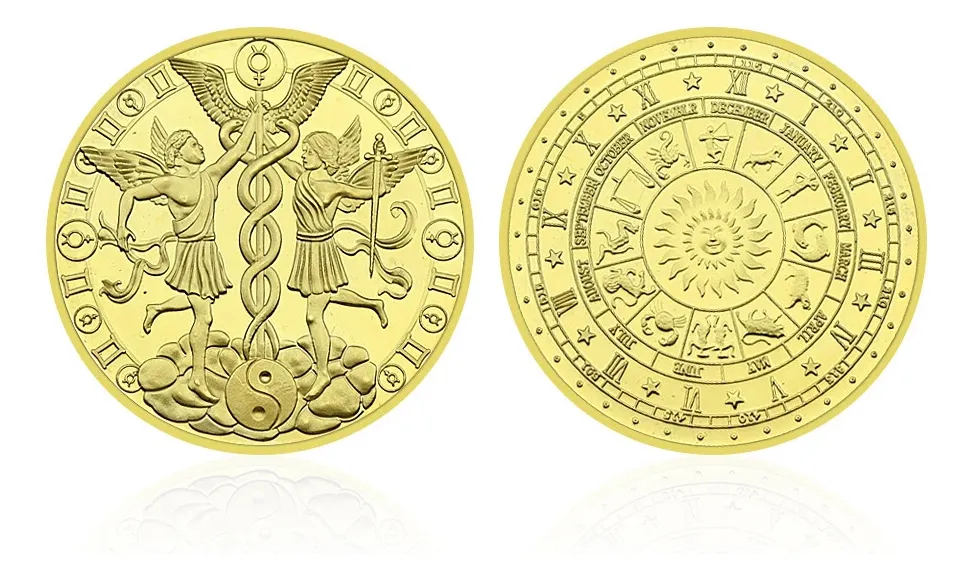 Moneda Géminis bañada en oro 24k con gemelos. Dualidad y comunicación
