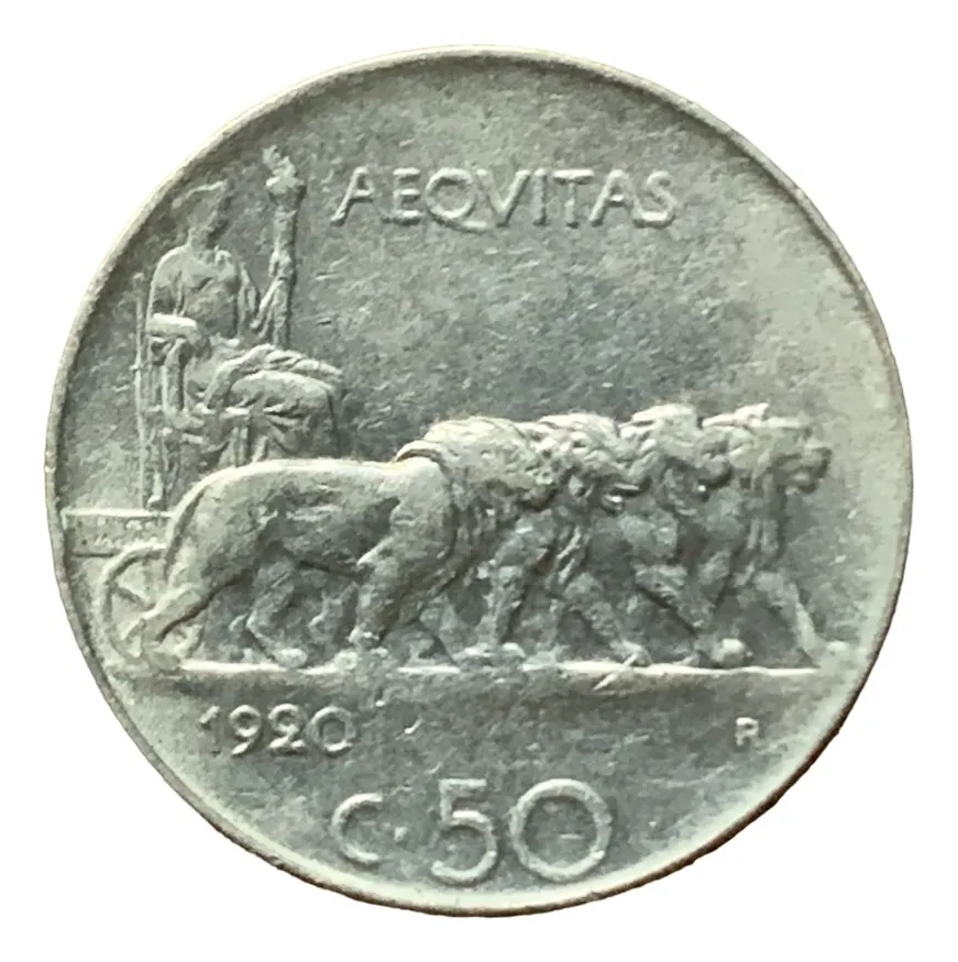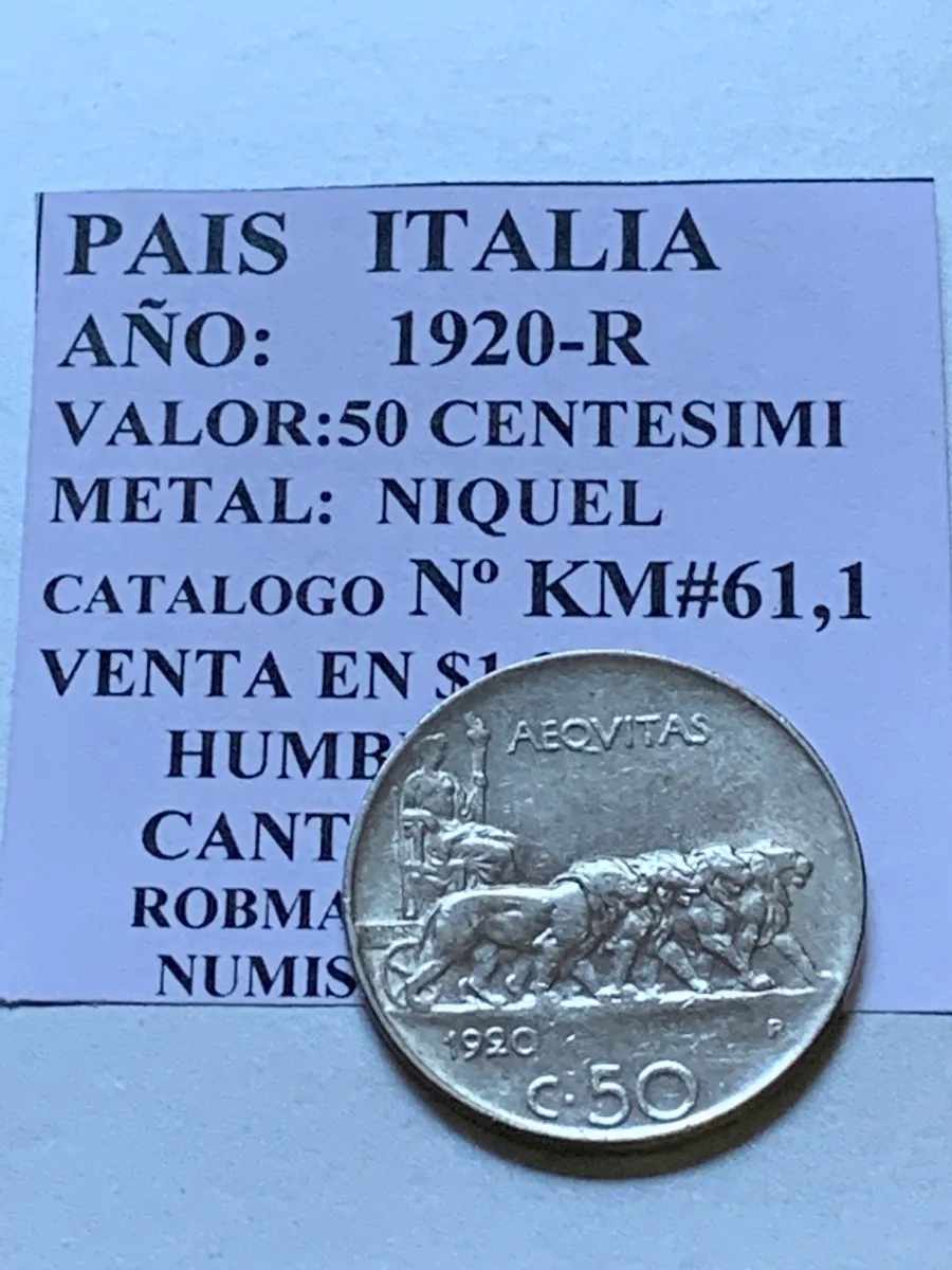 Moneda 50 centesimi Italia 1920-R en nÃquel, KM.61.1. Pieza clásica del sistema decimal italiano de principios de siglo XX.​–moneda dificil de conseguir, de la ceca italiana, hay mas valores faciales y años hasta la actualidad, si le falta alguno en su coleccion consultenos y trataremos de conseguirselo