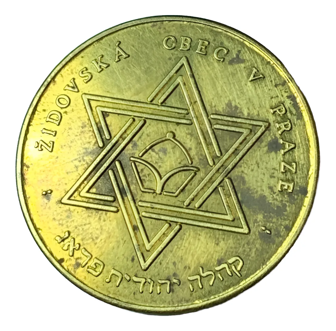 Medalla conmemorativa dedicada a la Sinagoga de Prada y la estrella de Israel, fusiona elementos arquitectónicos y religiosos, perfecta para coleccionistas de temática israelita.