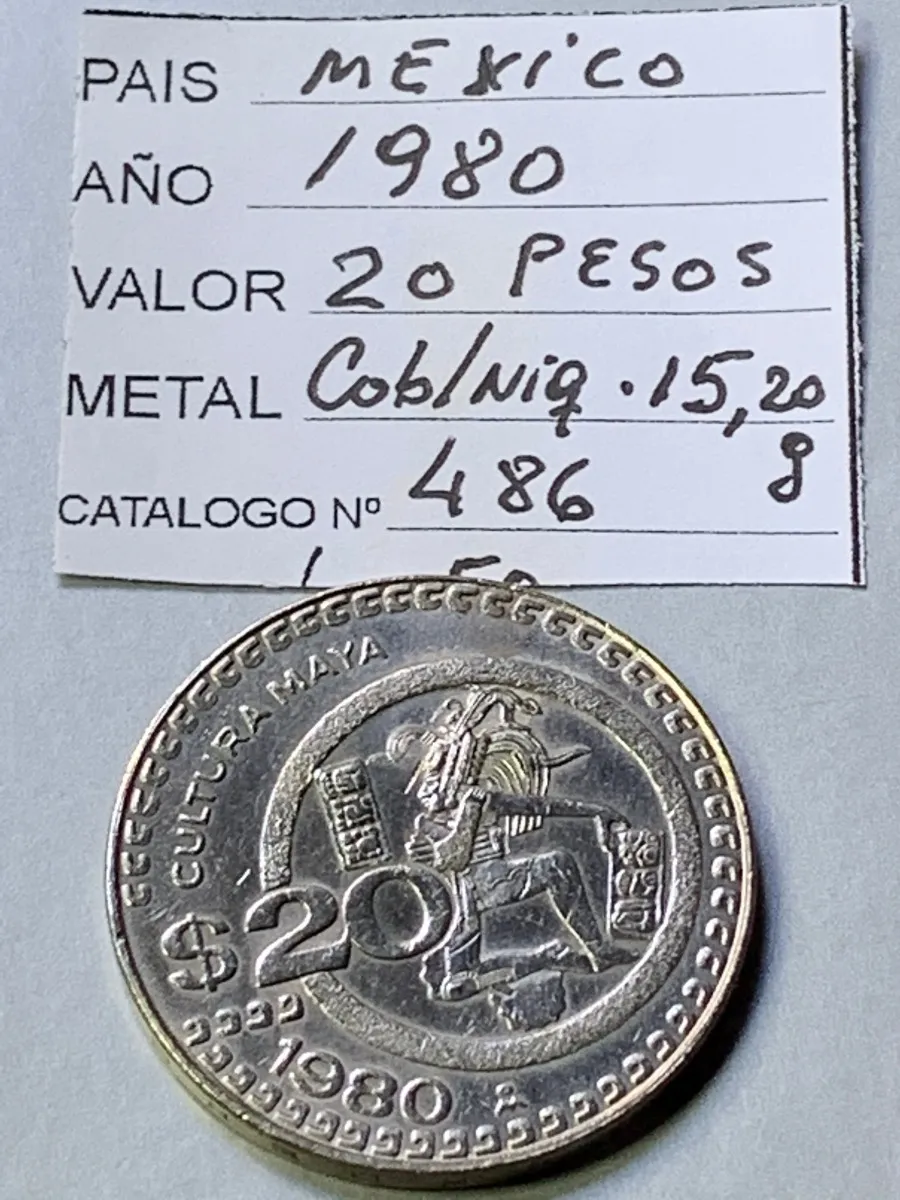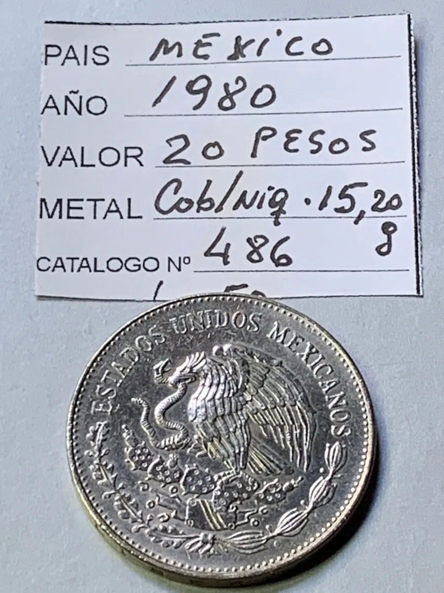 Moneda mexicana 20 pesos 1980, KM 486, cobre‑níquel, período pre‑nuevo peso. Ideal para colecciones de inflación si quiere pedir alguna otra moneda para su coleccion que le falte pedirla si latenemos la publicamos