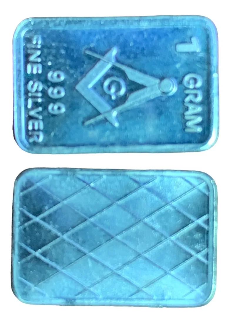 Moneda rectangular de 1 gramo de plata 0,999, con sĂmbolo masĂłnico grabado. Pieza nueva y sofisticada para coleccionistas interesados en sĂmbolos y alta pureza en formato no convencional.