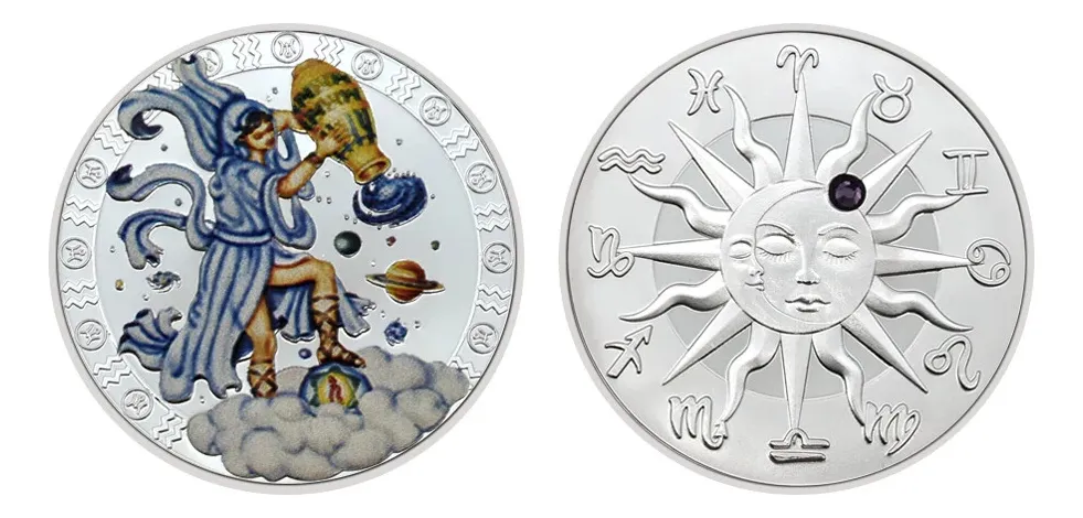 ROBMAR-USA-MONEDA BAÑO EN PLATA 24K. Y PINTADA EN LACA DEL SIGNO DEL SODIACO- ACUARIO Y SIMIL GEMA INCRUSTADA AL DORSO