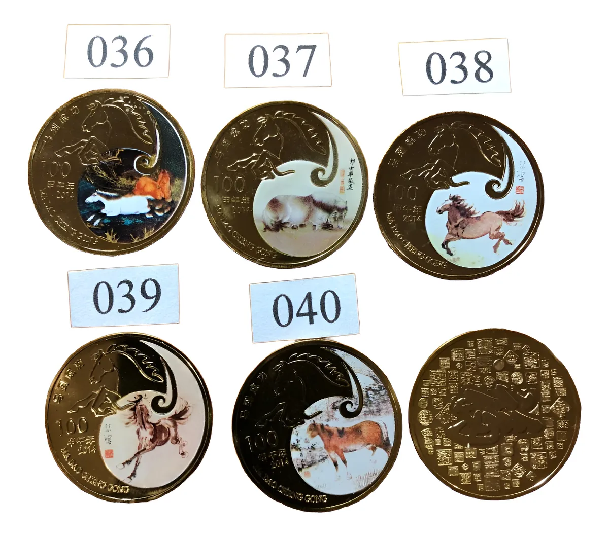Monedas caballo lunar 035–040, cierre de tramo de la serie. Excelente para completar la colección numerada.el precio es por cada una, escelente moneda de la serie del caballo lunar (de los signos del sodiaco chino) con 100 motivos con motivos diferentes elija el numero que le guste y valla armando esta coleccion magnifica cada moneda diferentes motivos hermosos de este caballo singular, consulte por el stock dado que solo tenemos 1 de cada uno y la demanda va mermando su stock no se los pierda, has mas publicados en esta pagina