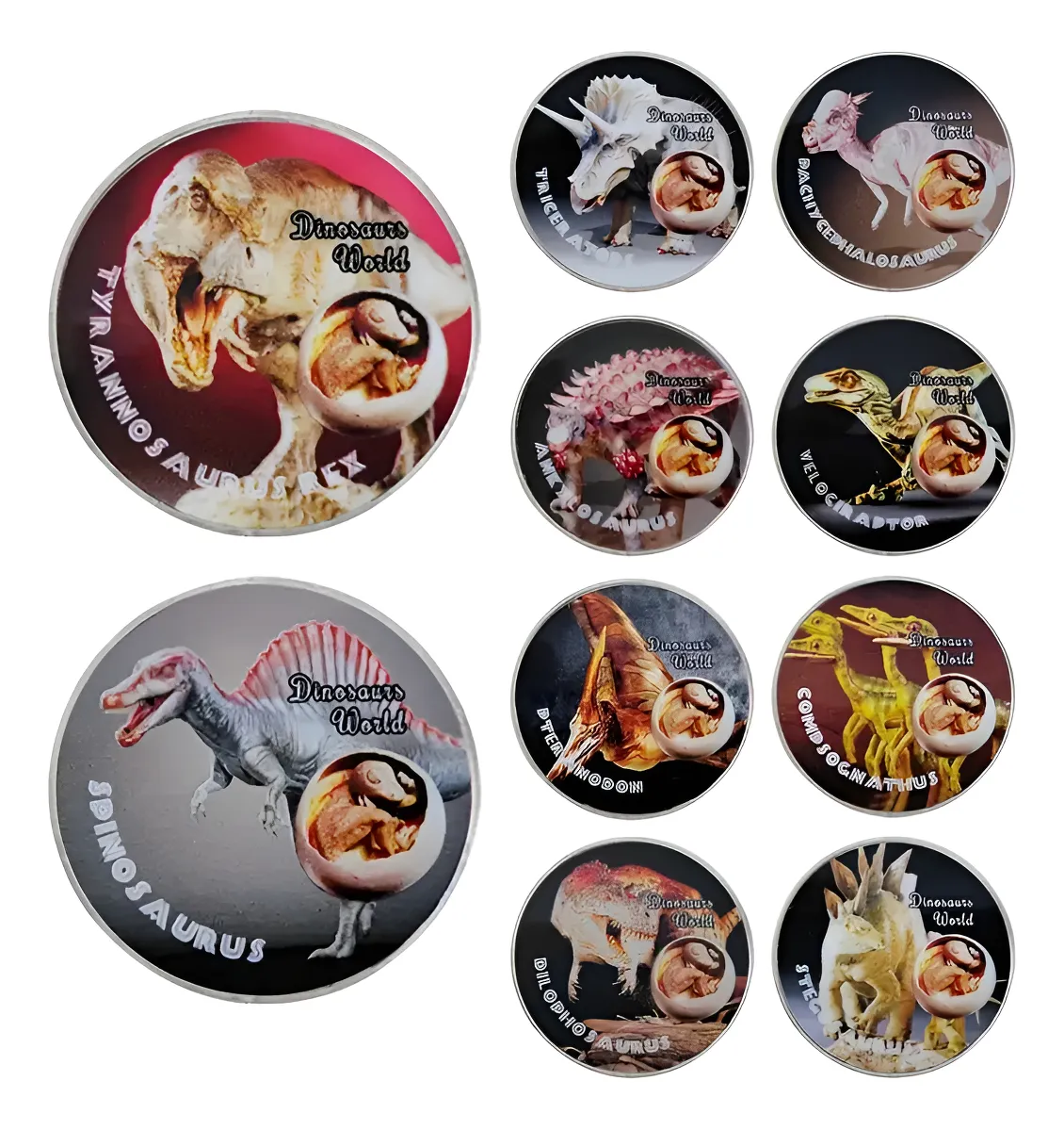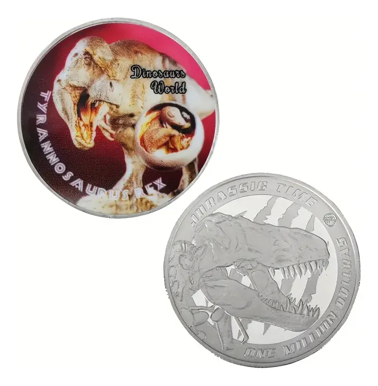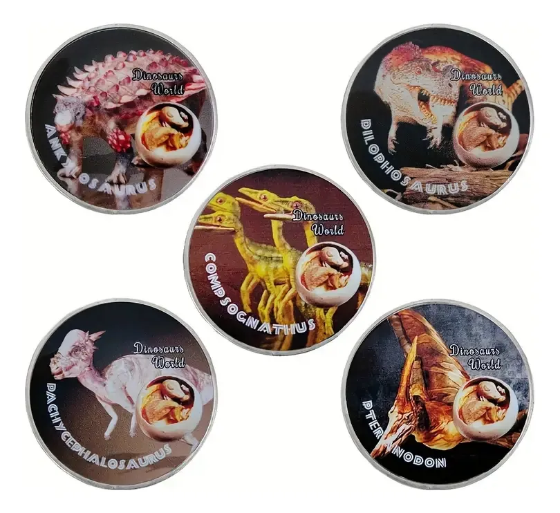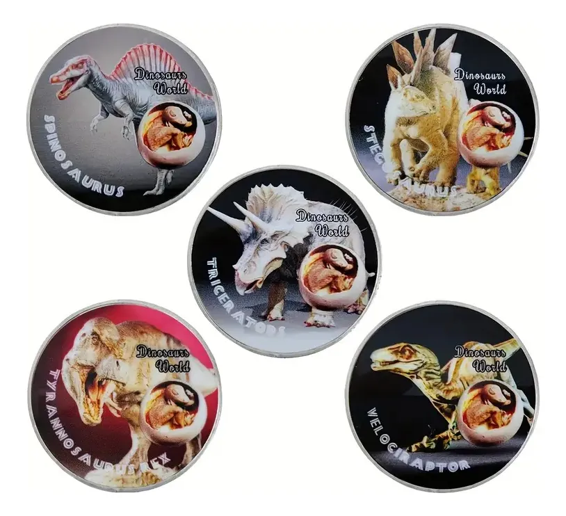 Monedas con dinosaurios prehistóricos diferentes, a elegir por unidad. Ideal para niños y coleccionistas de paleontologÃa.